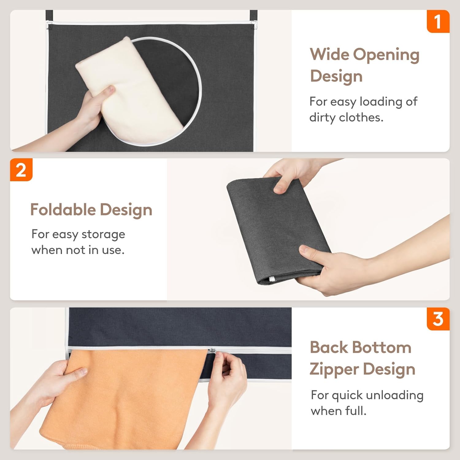 - Easy to Use: The over the door hamper for bathroom features a wide opening design for easy loading of dirty clothes and a smooth zipper at the back bottom for quick unloading when full. Folds up for storage when not in use.