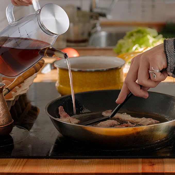 - 【Precisely display】Featured milliliters measurements mark on glass, easily monitor remaining oil and rightly controls oil use, which drastically reduces caloric intake and excess fat gain, make eating more heathier.