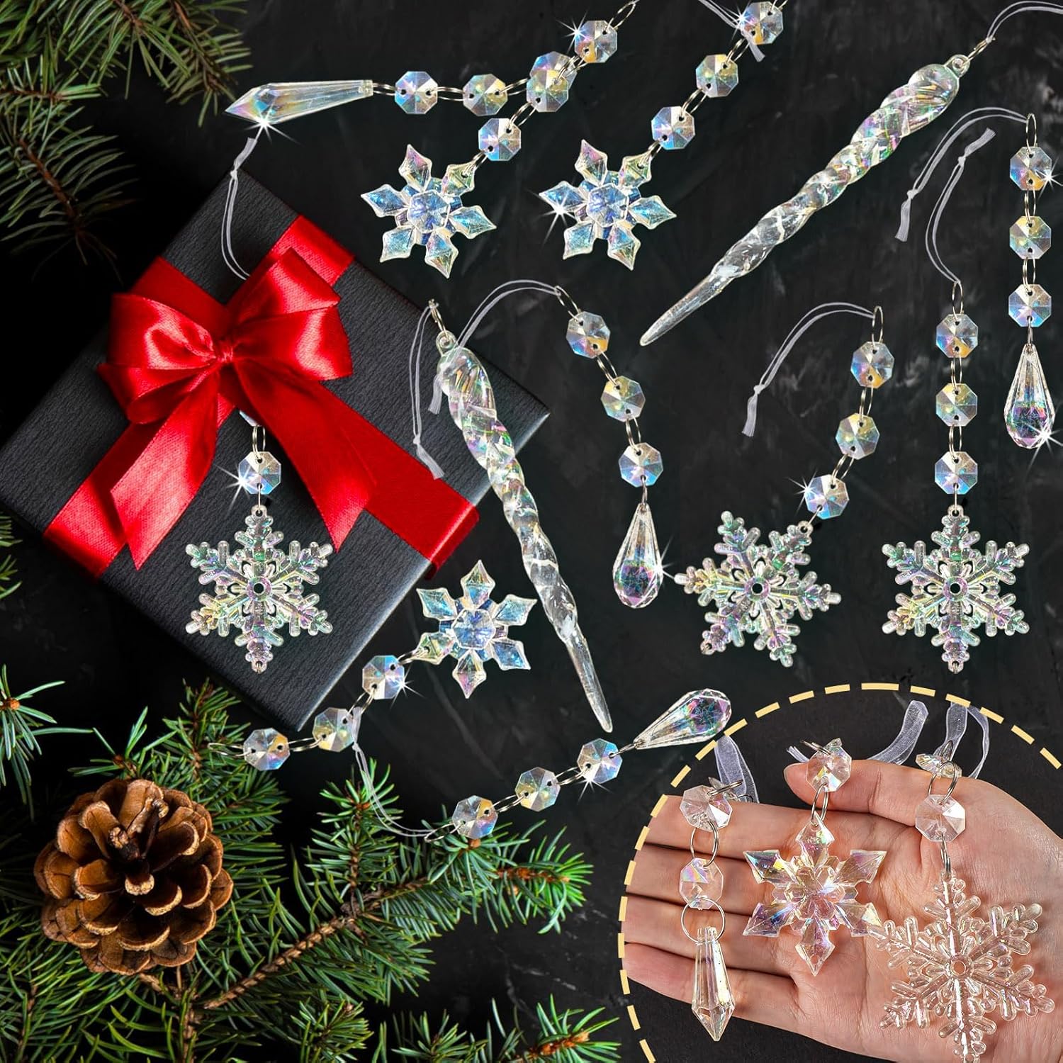 - VALUABLE PACK: Transform your holiday decor with this 80pcs iridescent acrylic Christmas ornaments set. Including 20pcs icicle pendants, 40pcs crystal beads garlands and 20pcs delicate snowflakes ornaments, these snowflake pendants shimmer with a rainbow effect under lights, adding an enchanting touch to your Christmas party decorations