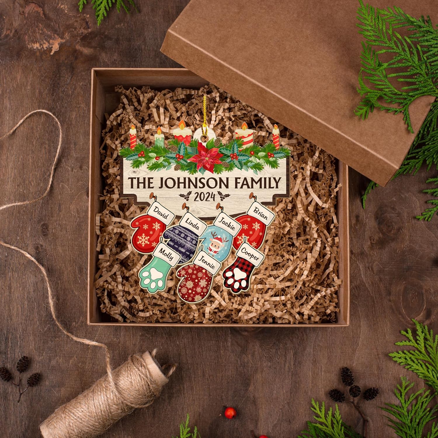 - ๐ Personalized Family Christmas Ornament - Celebrate your unique family this holiday season with the WRAPPINESS Family With Pet Ver 2 Personalized Wood Ornament. Customize each glove with family members' names and add stockings for pets, making it a beautiful and heartwarming addition to your Christmas tree.