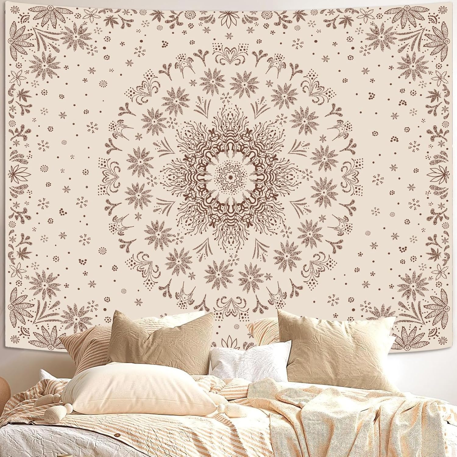 Fowocu Boho Floral Mandala Tapestry Wall Hanging Bohemian Flower Medallion Tapestry Aesthetic Beige Brown Hippie Indian Small Tapestries for Bedroom Living Room Dorm Decor 60 x 44 Inch