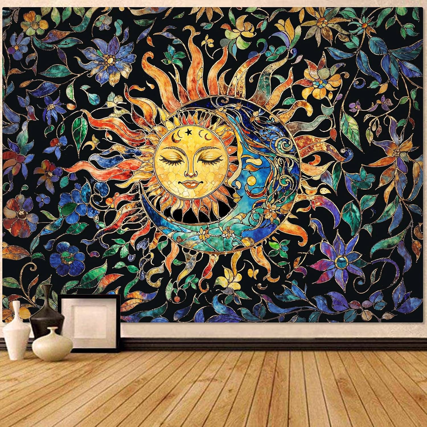 - Unique Stained Glass Design: This tapestry for bedroom features a stunning sun and moon pattern, enhanced with floral and plant branch elements, giving it a stained-glass-like aesthetic that adds a touch of elegance and mystery to any room