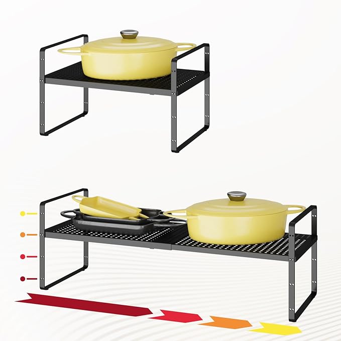 - Wide Range of Use:Cabinet shelf organizers can be stacked and used, one or more combined together. They can be placed in cabinets, food cupboards, on kitchen countertops or under the sink.