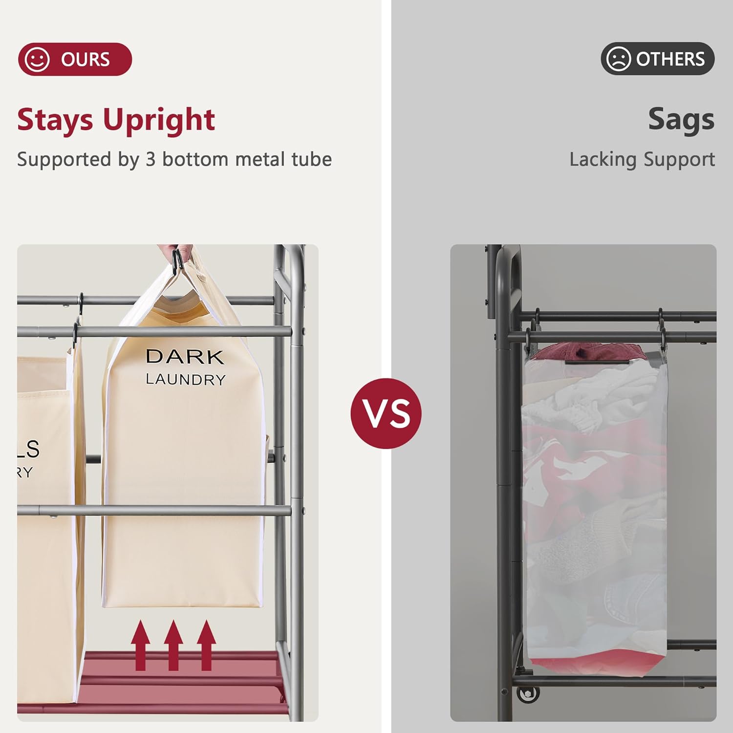 - 【Removable Bags】The laundry hamper with hanging rack comes with 4 laundry bags, each of which can be taken out of the laundry cart individually, Simply use the two metal handles to lift the laundry bag, making it easy to transport the laundry in and out of the laundry room.