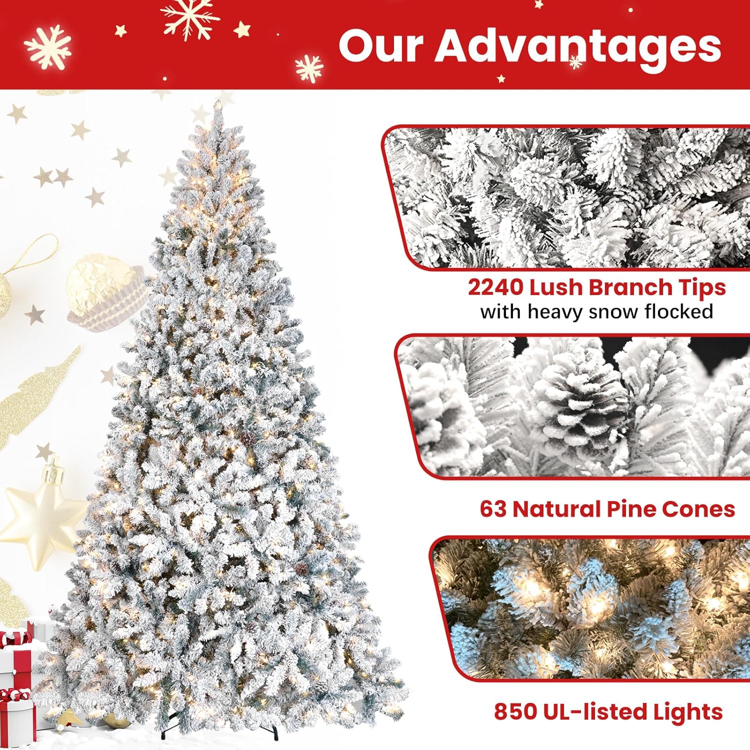 - 9ft Christmas tree is beautifully adorned with LED lights and measures 65 inches in diameter. It features 63 pine cones, 850 UL-listed plug-in lights, and 2240 snow-flocked branches. The base of the tree has been thickened and reinforced, resulting in a full and lifelike appearance. Let this illuminated Christmas tree enhance your space and create enchanting moments.