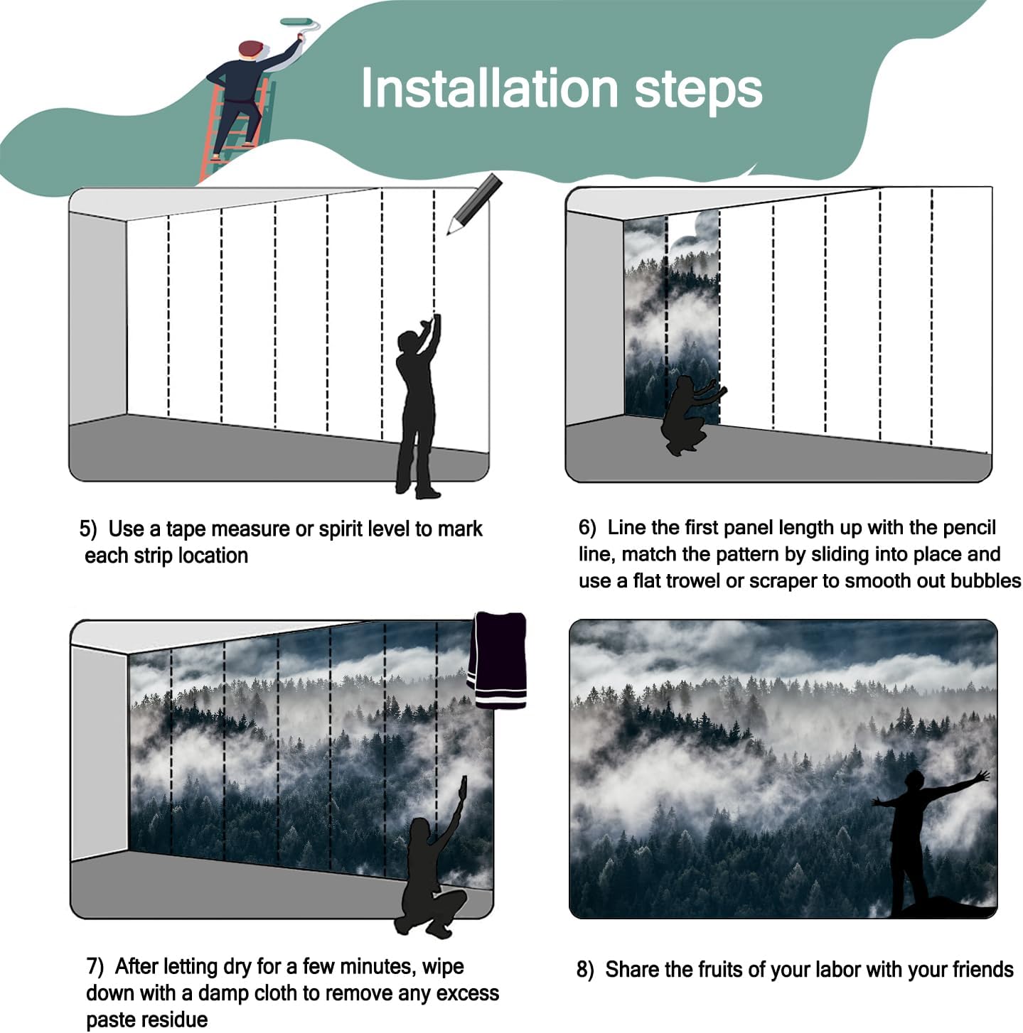 - Mural wallpaper size: 100 "W x 65 "H, divided into 5 sections, each section is labeled with a number underneath, there is no need to overlap the pattern when installing, just install according to the number labeled underneath the panel