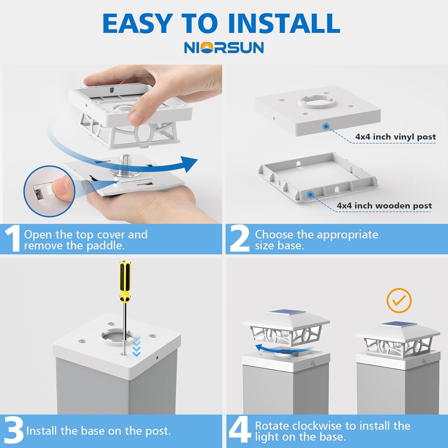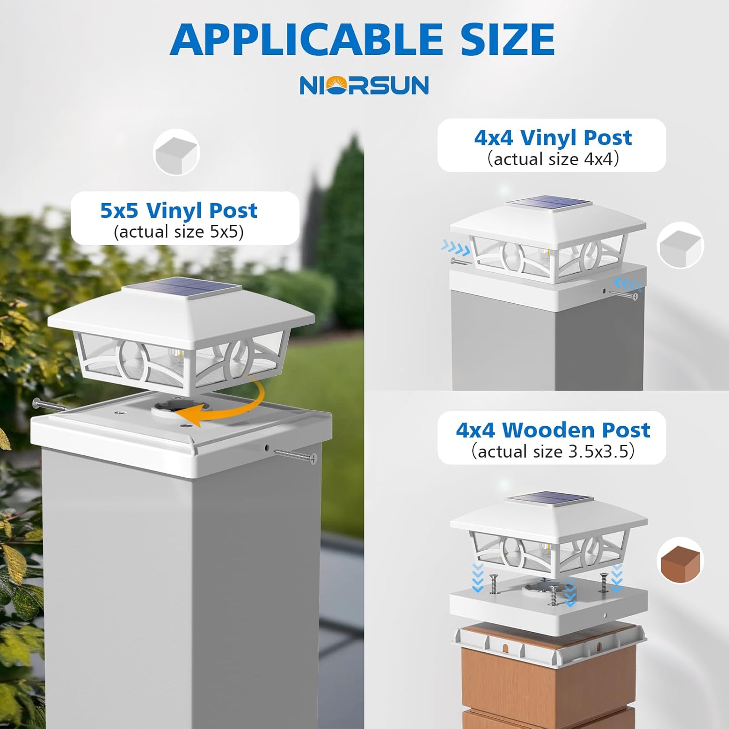 - Applicable Size & Easy Installation: NIORSUN 4x4 solar post cap lights are designed with different sizes of bases, making them compatible with standard 3.5x3.5 4x4 5x5 wood or vinyl posts. These solar deck post lights offer a hassle-free installation—no wiring required. Simply mount the solar post lights using the included mounting screws on your fence post capsNIORSUN 4x4 solar post cap lights are designed with different sizes of bases, making them compatible with standard 3.5x3.5 4x4 5x5 wood or vinyl posts. These solar deck post lights offer a hassle-free installation—no wiring required. Simply mount the solar post lights using the included mounting screws on your fence post caps