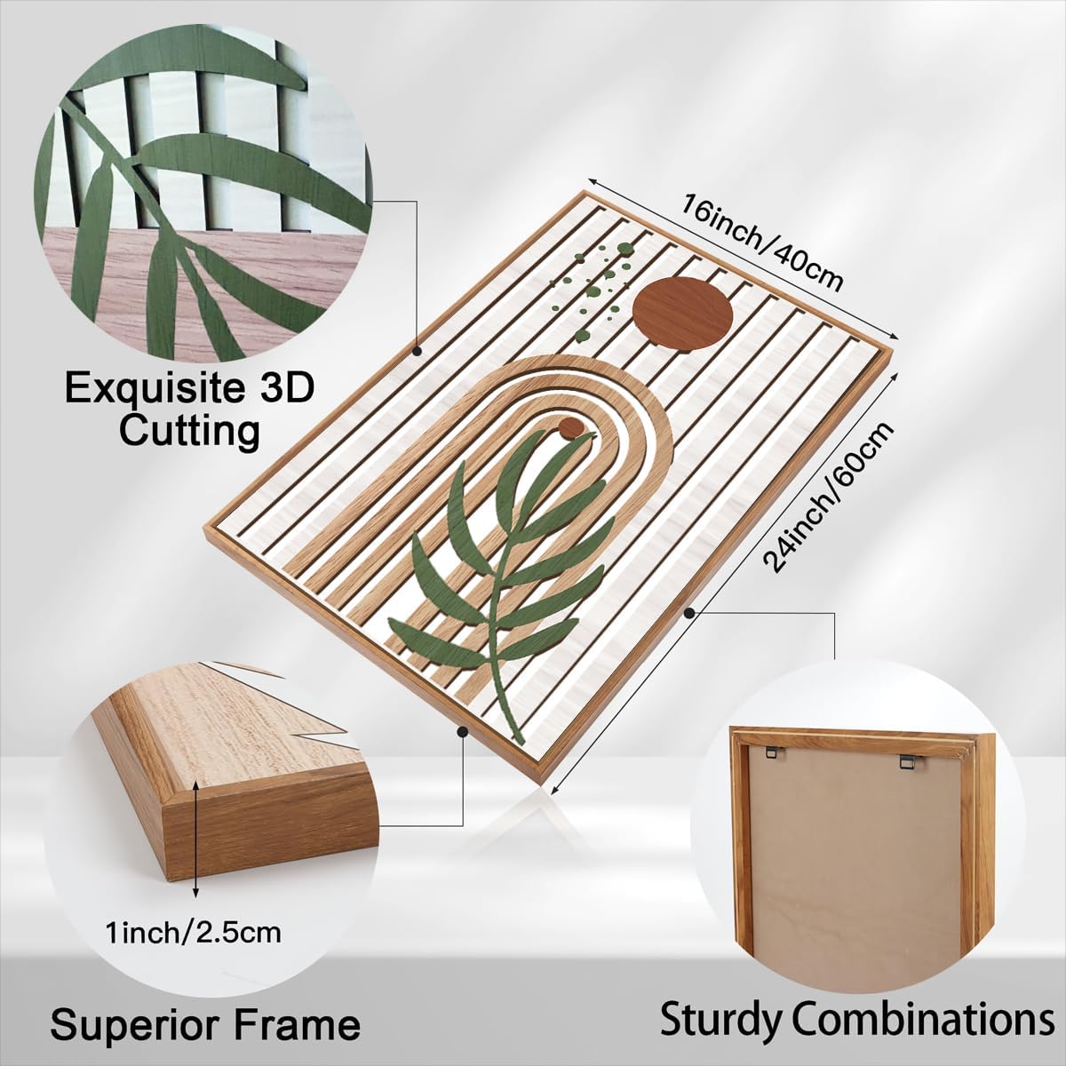 Large Boho Mid Century Wood Wall Art Set Modern Bohemian Wooden Wall Decor Minimalist Leaf Art Decor Abstract Geometric Wall Sculptures for Living Room Bedroom Office-16x24Inchx3