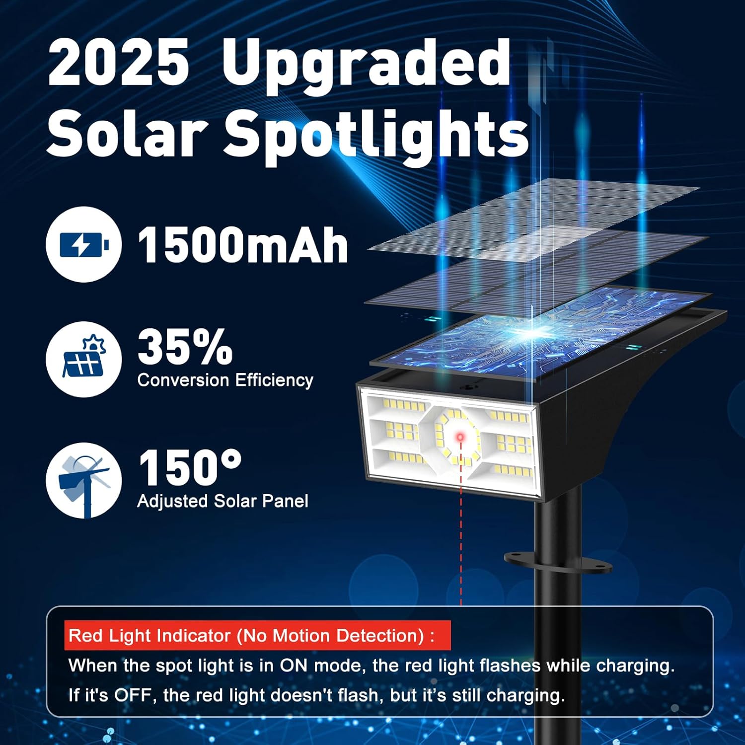- 【𝐋𝐨𝐧𝐠-𝐋𝐚𝐬𝐭𝐢𝐧𝐠 𝐈𝐥𝐥𝐮𝐦𝐢𝐧𝐚𝐭𝐢𝐨𝐧】Equipped with 56 LEDs, our solar spotlights outdoor waterproof create the perfect lighting effect wherever they are placed. The 150°adjustable head allows you to direct light exactly where you need it. Harness the power of the sun to brighten your garden without high electricity costs. With a maximum brightness of 1000 lumens, these solar spot lights provide 10-24 hours of illumination depending on charge time—longer, brighter, and more durable than other solar lights on the market.