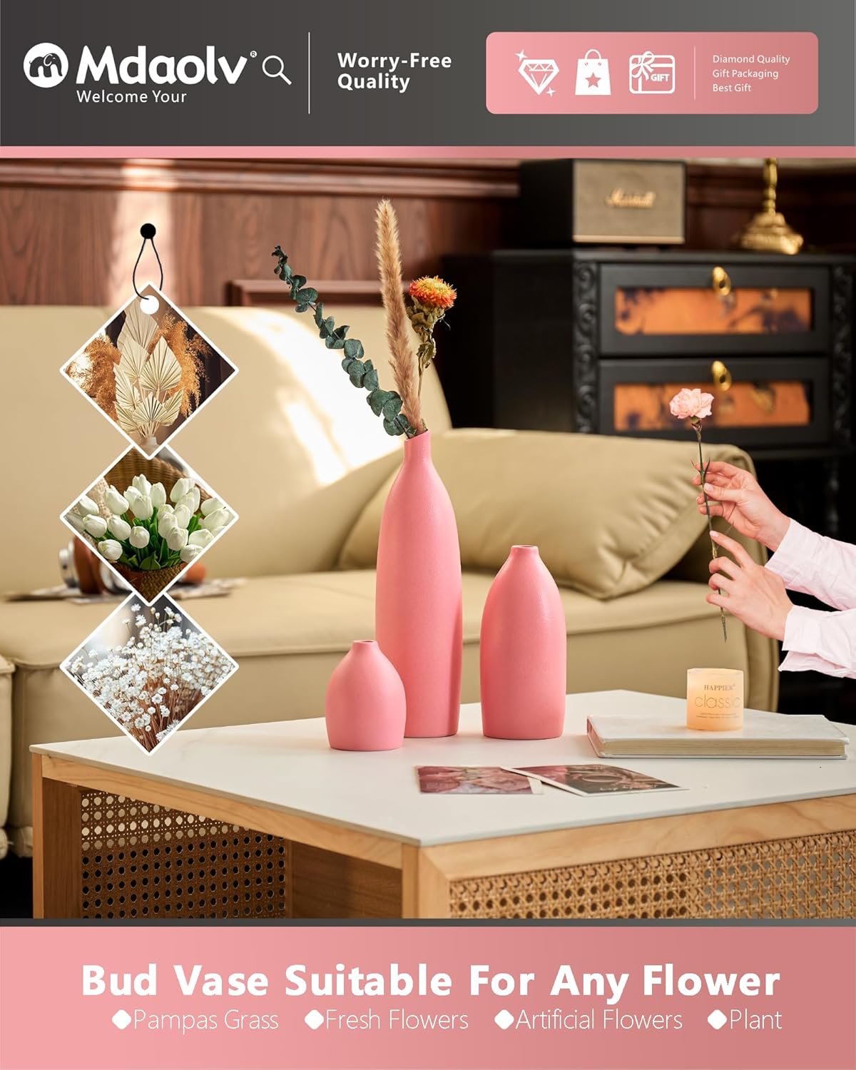 - Package Contents: 3x Pink Bohemian Vases, 1x English Manual, 1x Greeting Card, 1x Exquisite Gift Package *Please note* Search *Mdaolv* to discover more decorative vases.