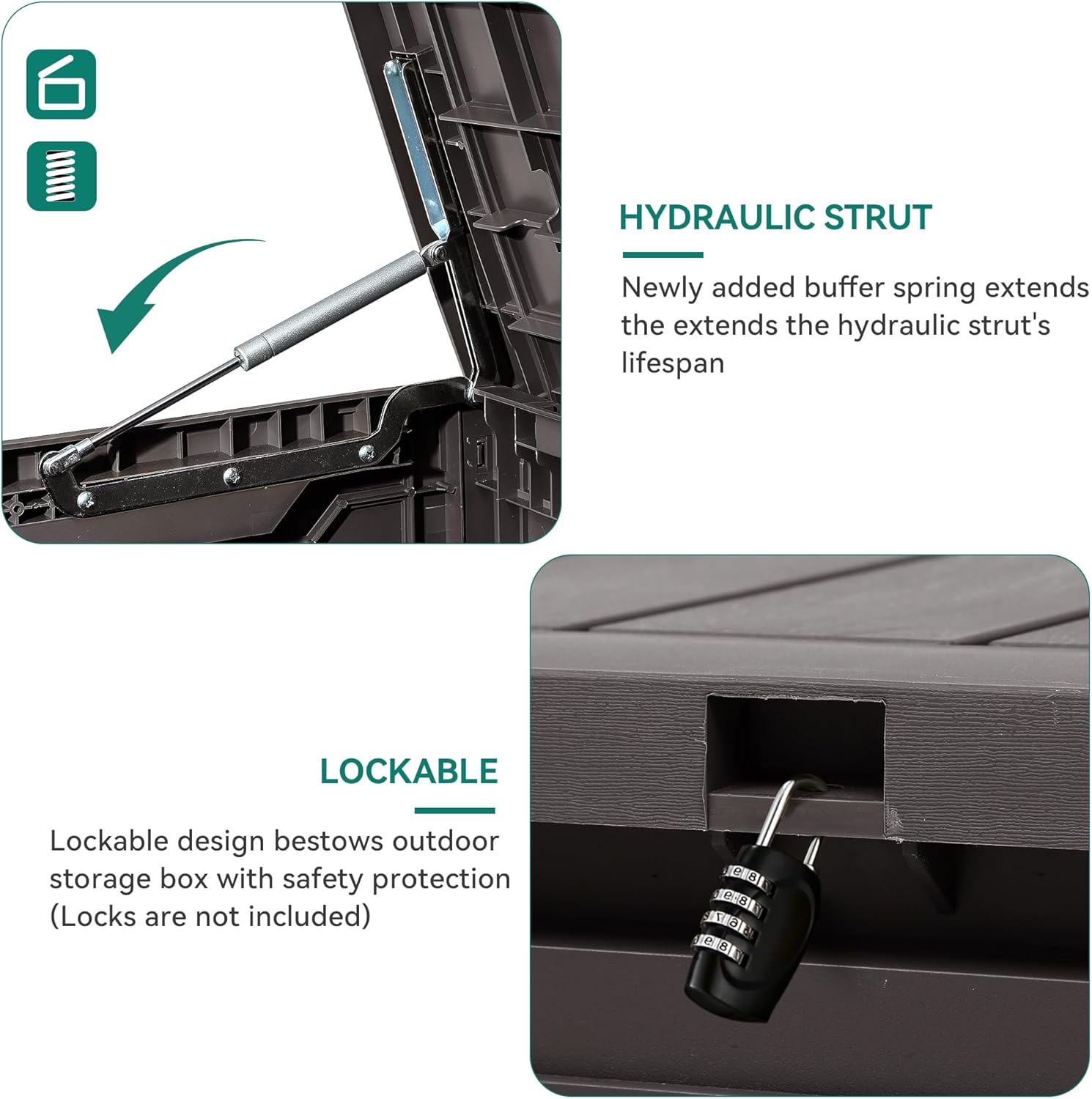 - User-Friendly Design: These outdoor deck boxes are equipped with hydraulic struts for smooth and safe operation, as well as dual built-in side handles, making it easy to move around as needed