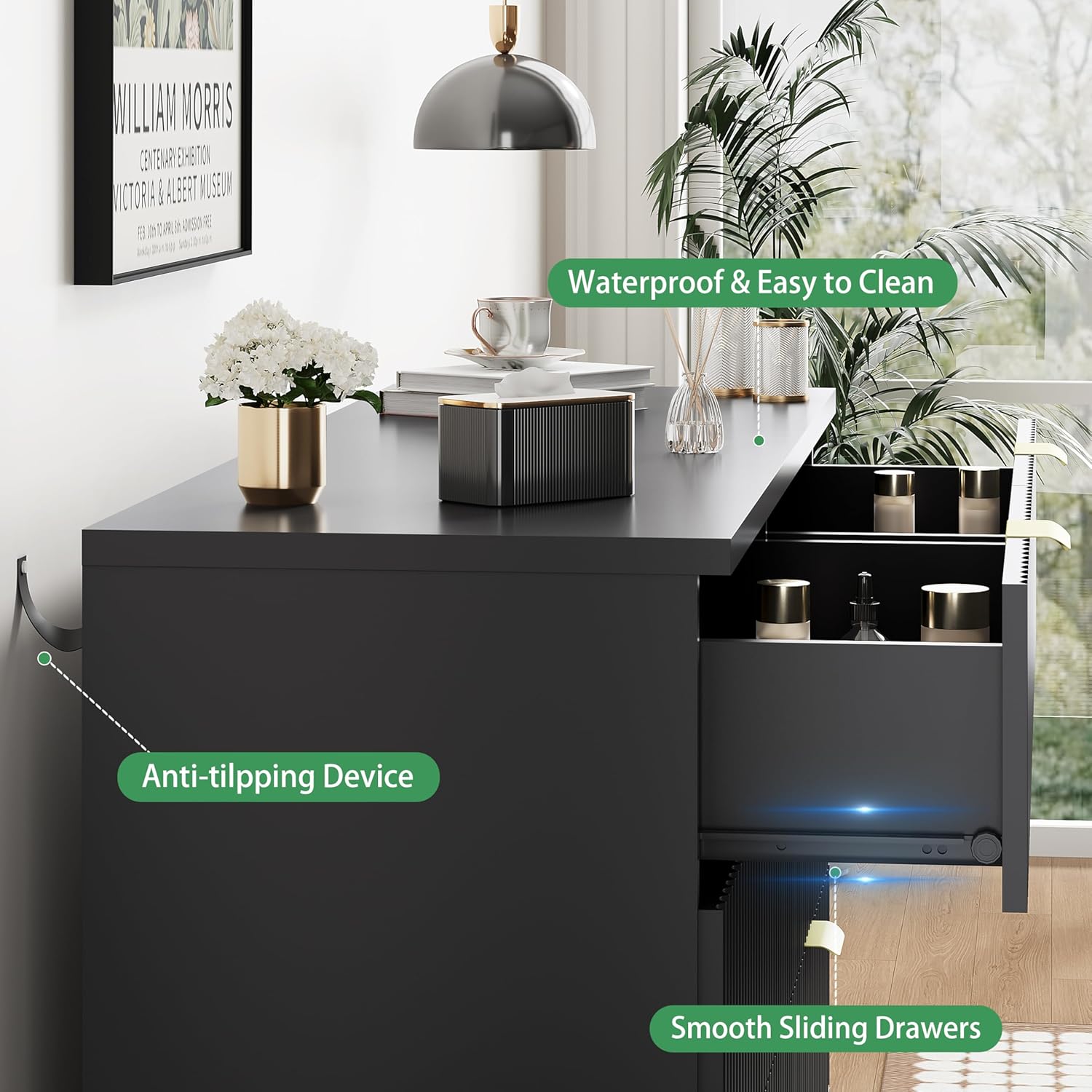 - 【Modern Chic Appearance】The unique wave-like fluted panel enhances the texture and elegance of this bedroom dresser. The thick table top features natural wood grain that complements the black finish. The wide metal handle and splayed base legs add a modern touch, creating a personalized and distinctive appearance