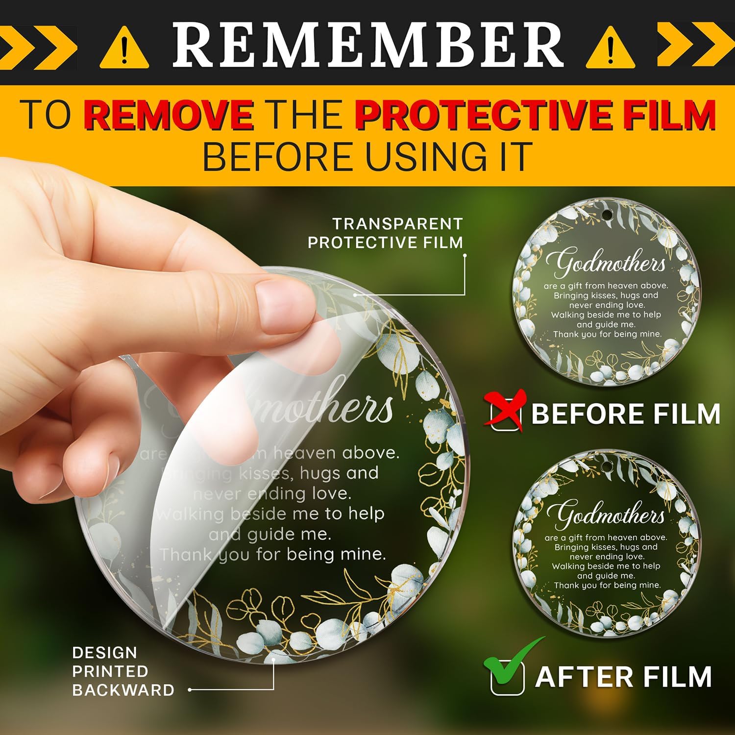 - ACRYLIC MATERIAL: Made from acrylic with a transparent protective film on the front to prevent scratches. The design is printed on the back, and to fully appreciate the ornament's beauty, remove the protective film to reveal the clear acrylic finish