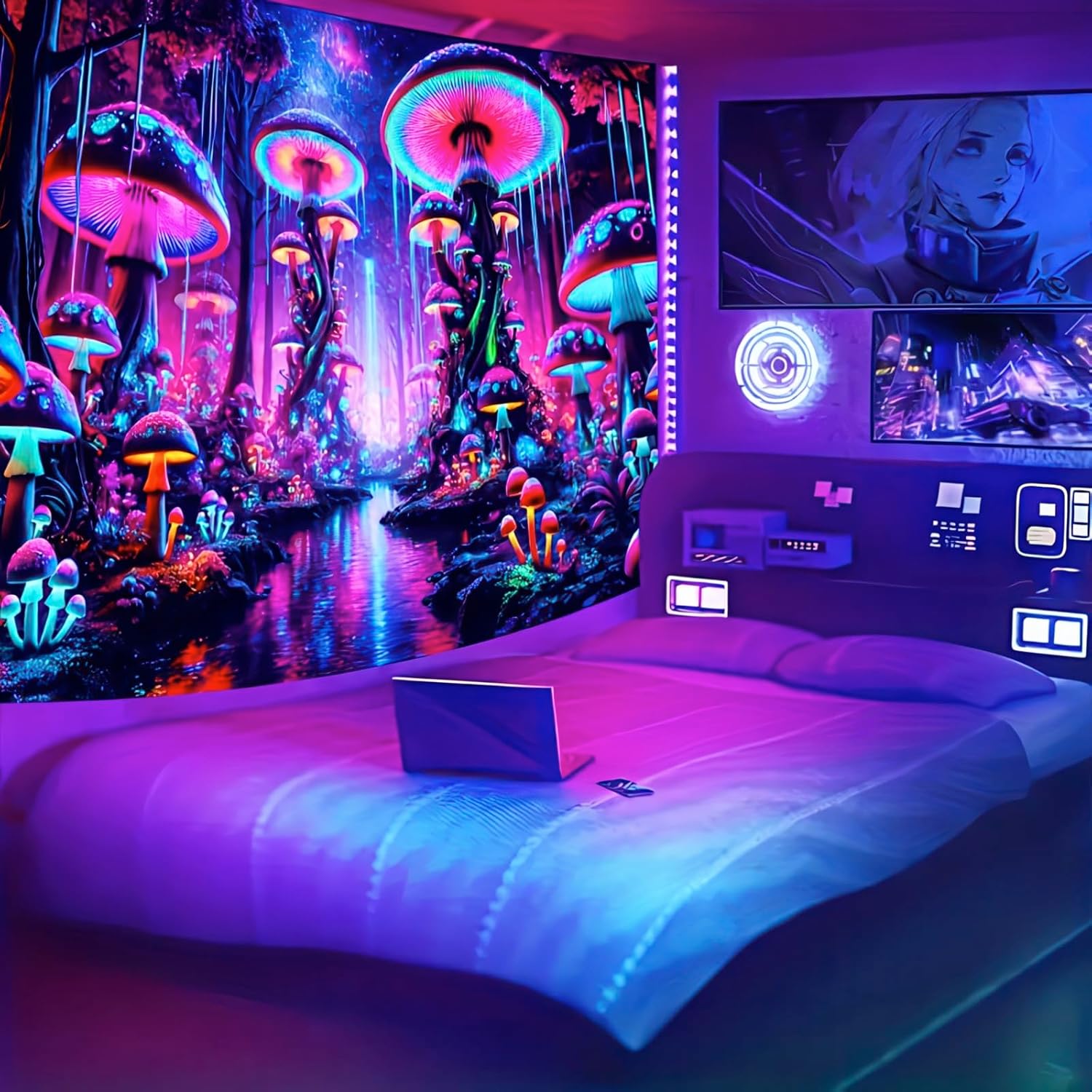 BlissYard Blacklight Tapestry UV Reactive Mushroom Tapestries Fantasy Mountain Forest Landscape Tapestry Mysterious Jungle Moon Night Neon Flower Wall Hanging Glow in the Dark Backdrop 59" x 80"