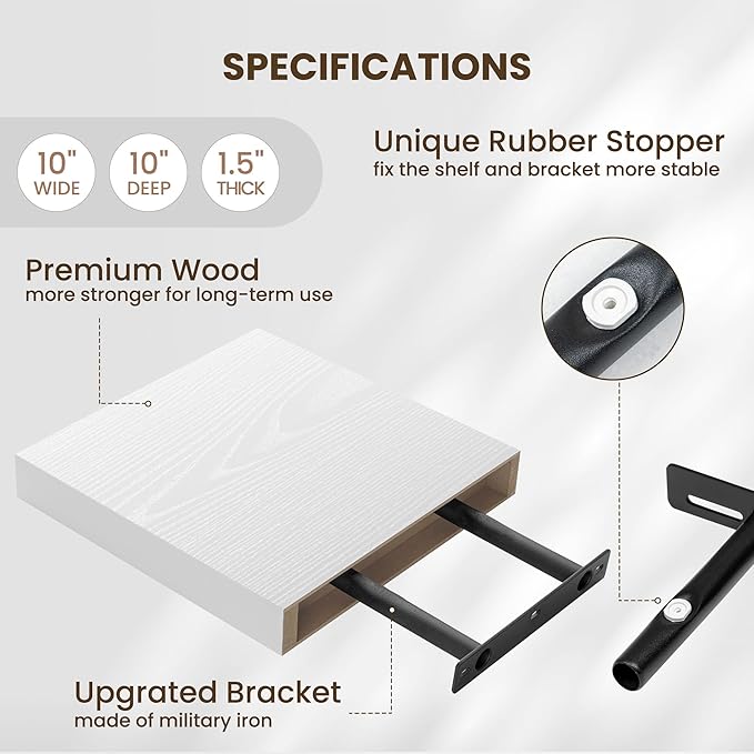 Fun Memories Floating Shelves for Wall 10 Inch, 10 Inch Deep Square Wall Shelves, Bathroom Storage Shelves Over Toilet, Wood Floating Shelves for Living Room Bedroom, White, Set of 2