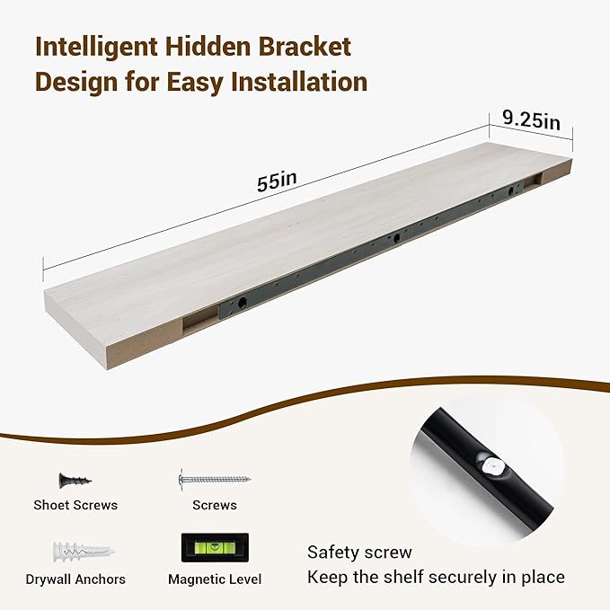 55 Inch Floating Shelves, 55"x9.25"x1.5" Inch Deep Floating Shelves for Wall, Wooden Shelves for Bathroom, Bedroom, Living Room, Cream White Oak