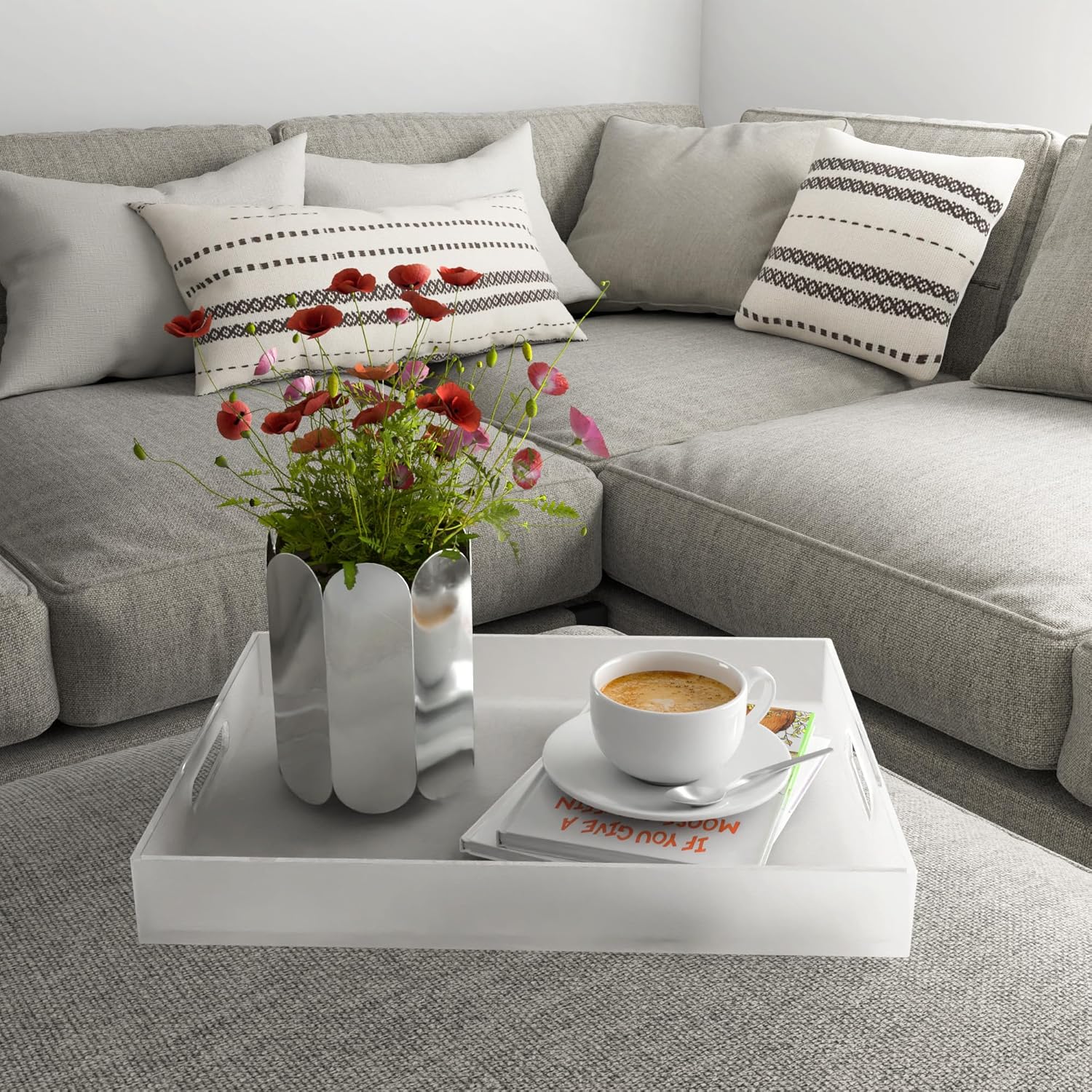 - MULTIPURPOSE ORGANIZER: Our tray can hold coffee, food, tea, fruit, snacks, appetizers, desserts, and drinks at the bar, kitchen, or party according to your needs. Additionally, it can also function as a vanity tray for bathroom, counter, or dresser tops while doubling up as an organizer for remote controls, magazines, makeup, toiletries, and more. Its adaptable design makes it a suitable addition to kitchens, bathrooms, vanity areas, and bars.