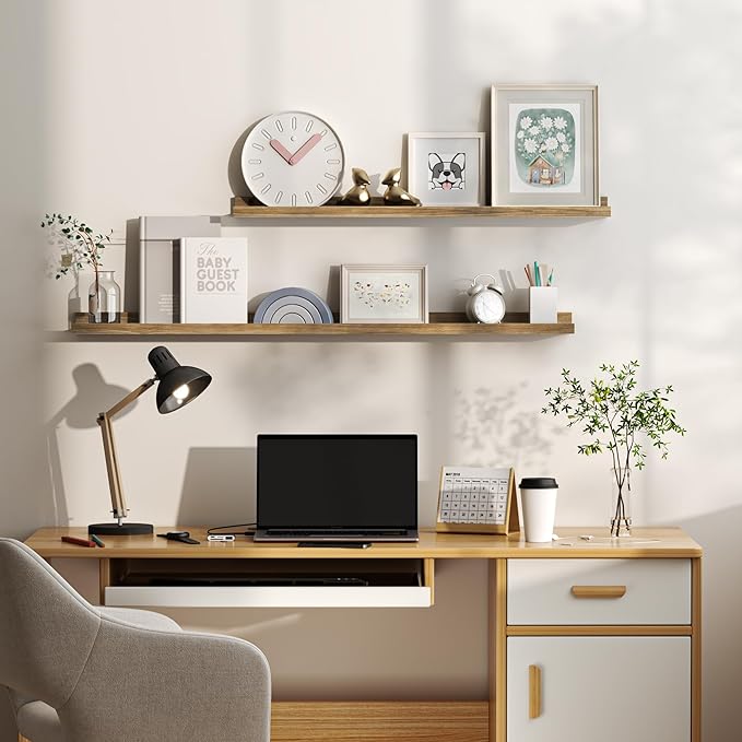 • Quick and Easy Installation: With pre-drilled holes, necessary hardware, and easy-to-follow instructions, our picture ledge shelves are a breeze to install. Each set even comes with a mini level for perfect alignment. Put them up in minutes and start decorating right away!