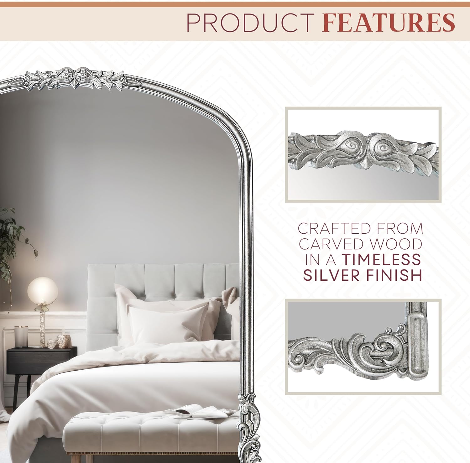 - QUALITY CONSTRUCTION: The Wylde Iris English Estate Framed Wall Mirror is crafted from carved engineered wood with glass front and features an antique silver finish.