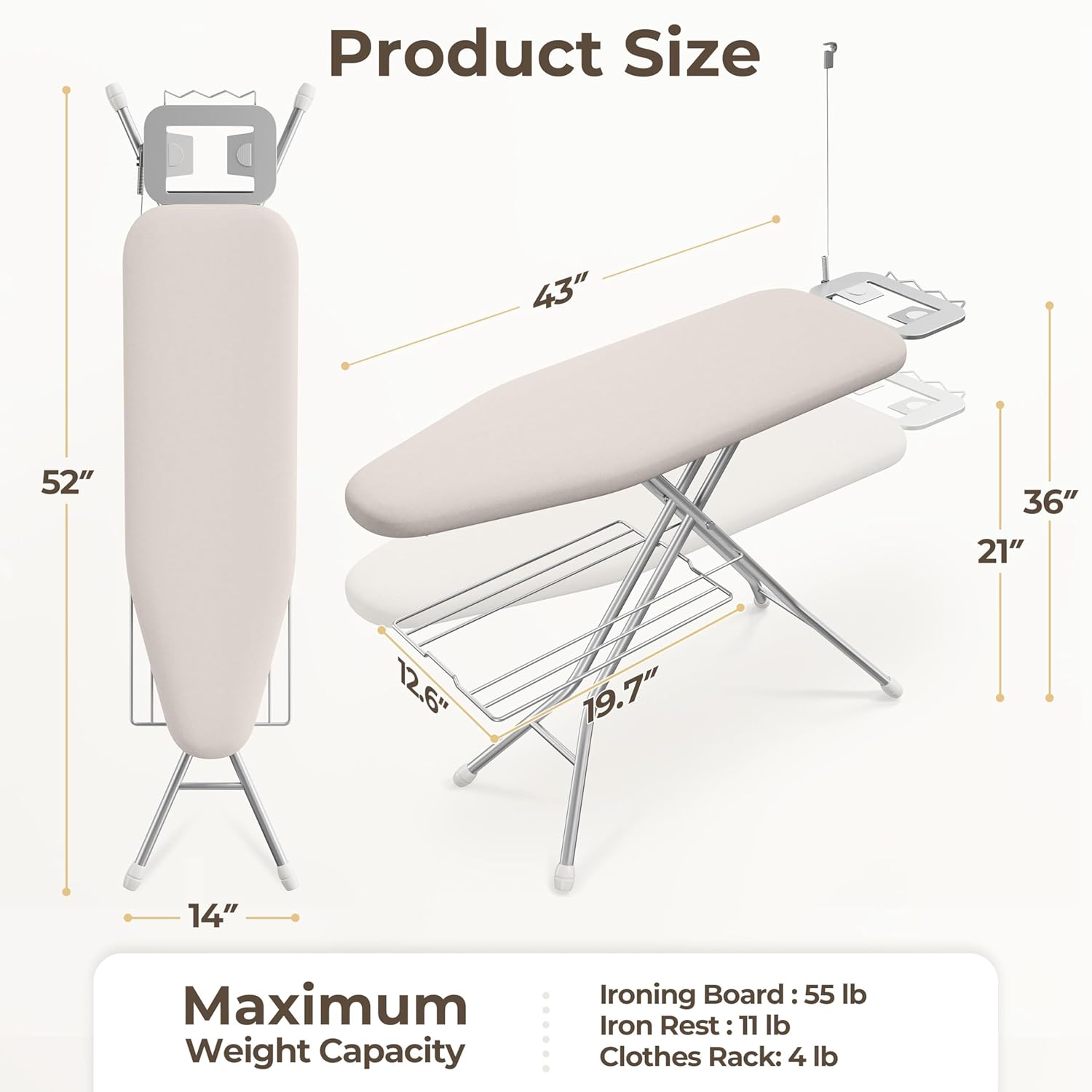 - Full-size Ironing Board: The iron stand provides ample space to meet all your ironing needs. The 43″ L× 14″ W surface ensures an efficient ironing and sewing experience and is ideal for larger garments