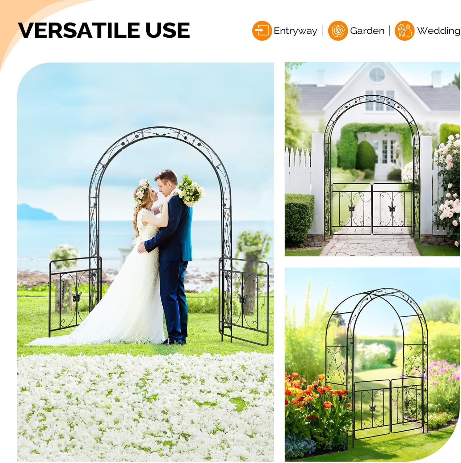 - Versatile application: The garden arch is suitable for various occasions, such as weddings, parties, garden decoration, and driveway entrances. It can also be used as It can effortlessly transform into a charming and picturesque photo booth backdrop for various occasions, including enchanting anniversaries, heartfelt ceremonies, mesmerizing outdoor weddings, lively outdoor parties, unforgettable receptions, or any other special event. Furthermore, it can also serve as a magnificent garden arbor