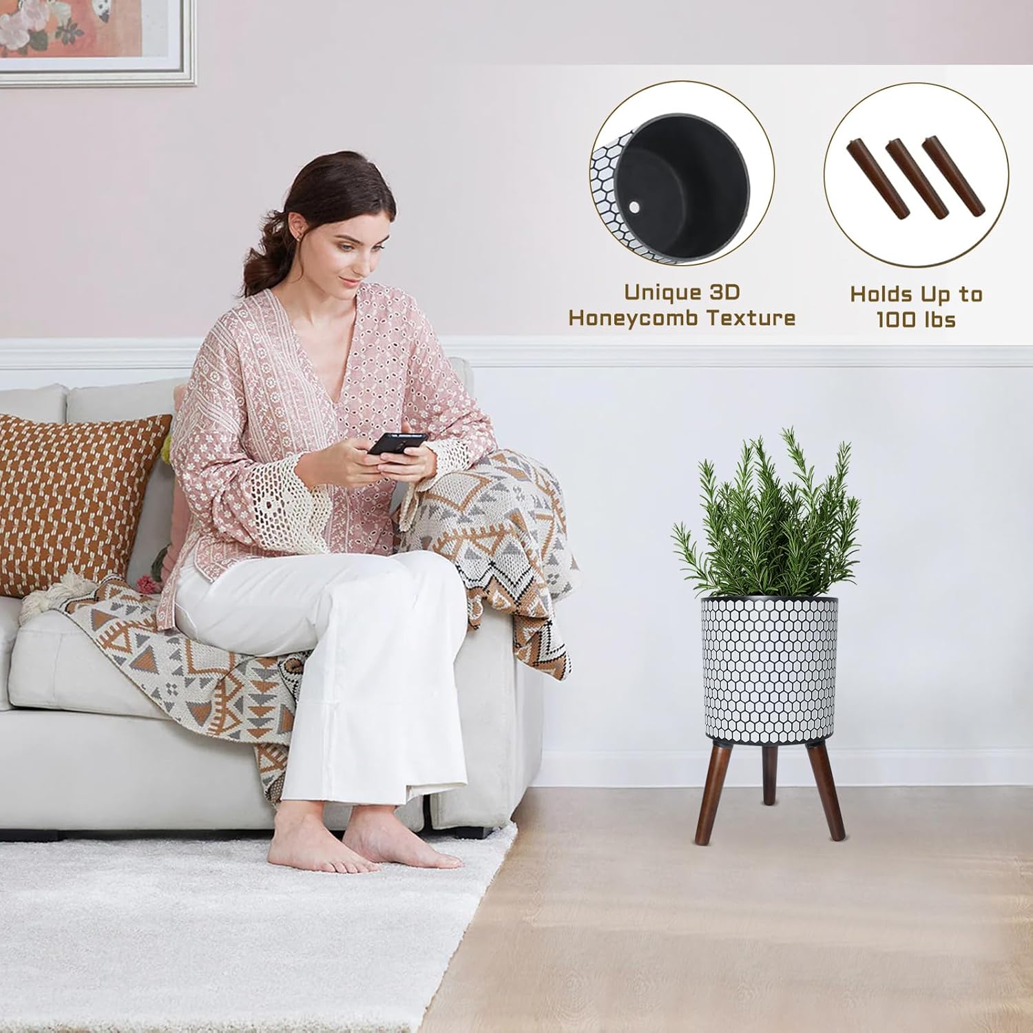 Flower Pot with Legs Tall Flower Pot with Drainage Holes for Indoor and Outdoor Decorative Planting (White Black Honeycomb, 12 Inches)
