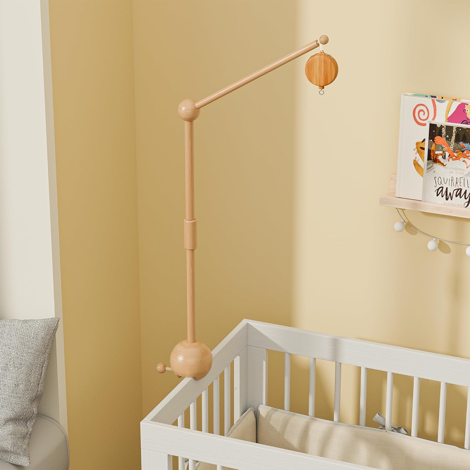 - 【About Mobile Holder】The baby crib mobile holder is made of 100% natural beech wood and is sprayed with environmentally friendly water-based paint on the surface, which is very sturdy and durable. The height of the holder can be adjusted in two modes of 22.5 and 32.5 inches, and the connecting ball on the top can rotate 360°, which greatly enhances the functionality and adaptability of this baby crib accessory. (Note: Applicable to baby crib guardrails with a thickness < 1.7 inches)