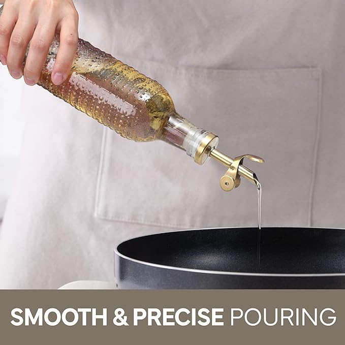 - Beautiful and Functional - Our colored glass oil dispensing bottles, with elegeant colors, gold tops and gold wire rack, will elevate your kitchen. Don't use just any oil bottle, upgrade the way you cook. That's our mission.