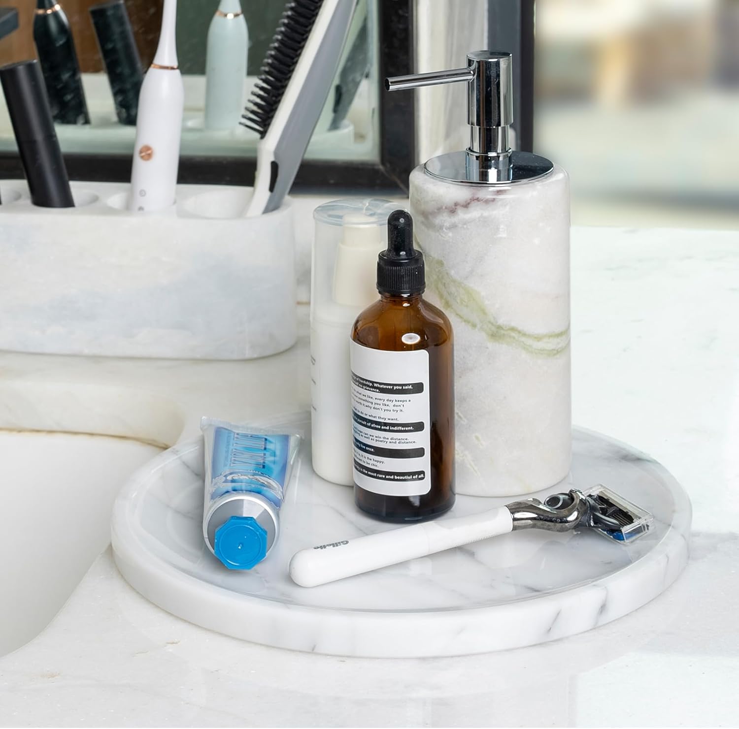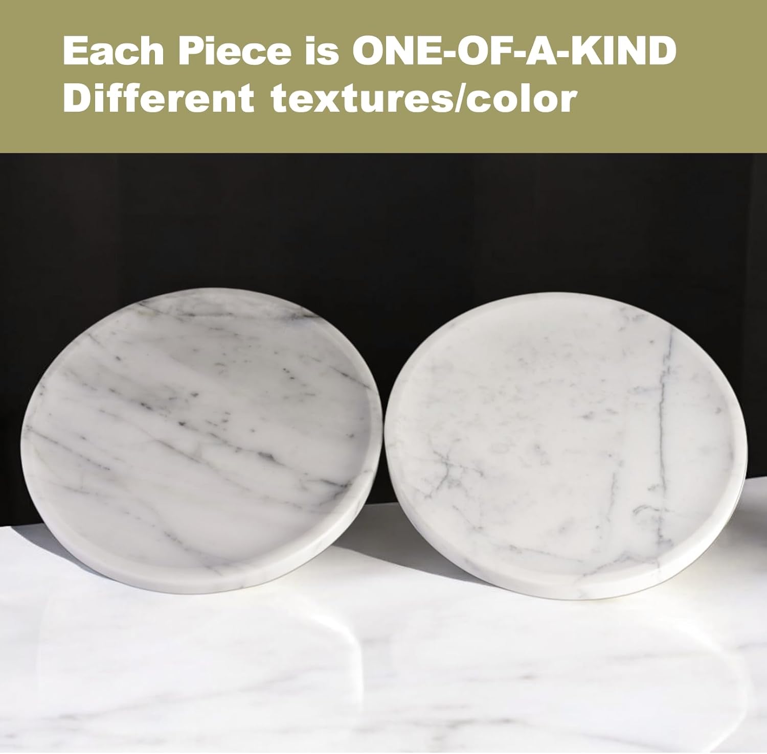 - Suitable Size: Our small round marble tray measures D9.8”x H0.7”. This bathroom counter tray fits bathroom washstands, kitchen counters, coffee tables, bedroom dressers, vanity tops, and bedside tables—ideal for organizing and enhancing your space