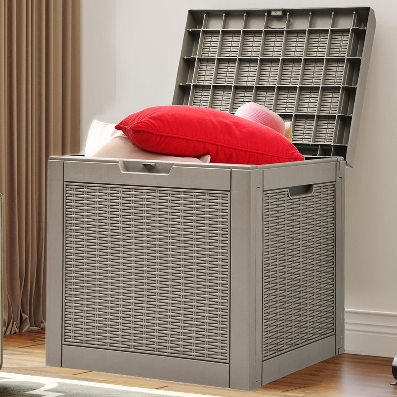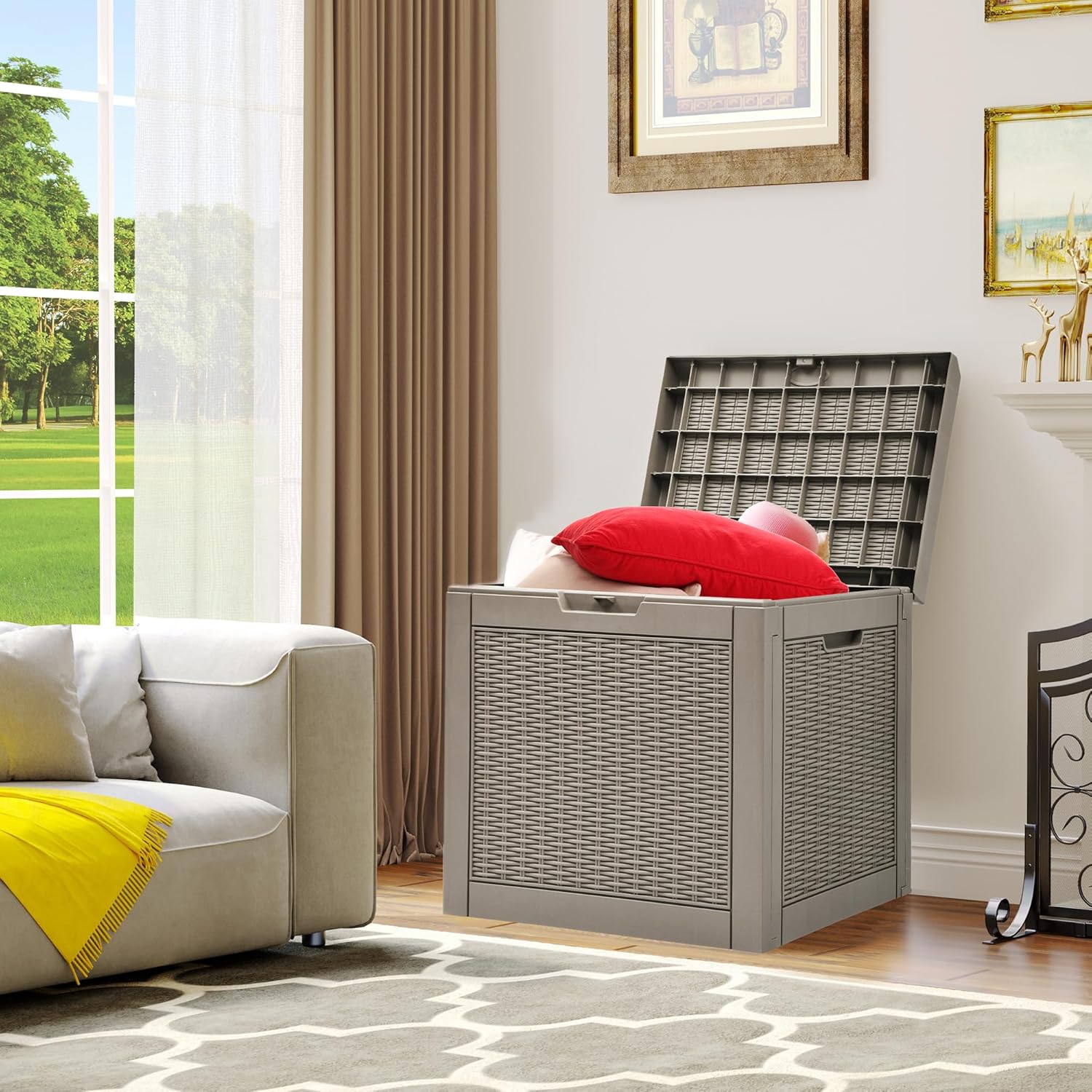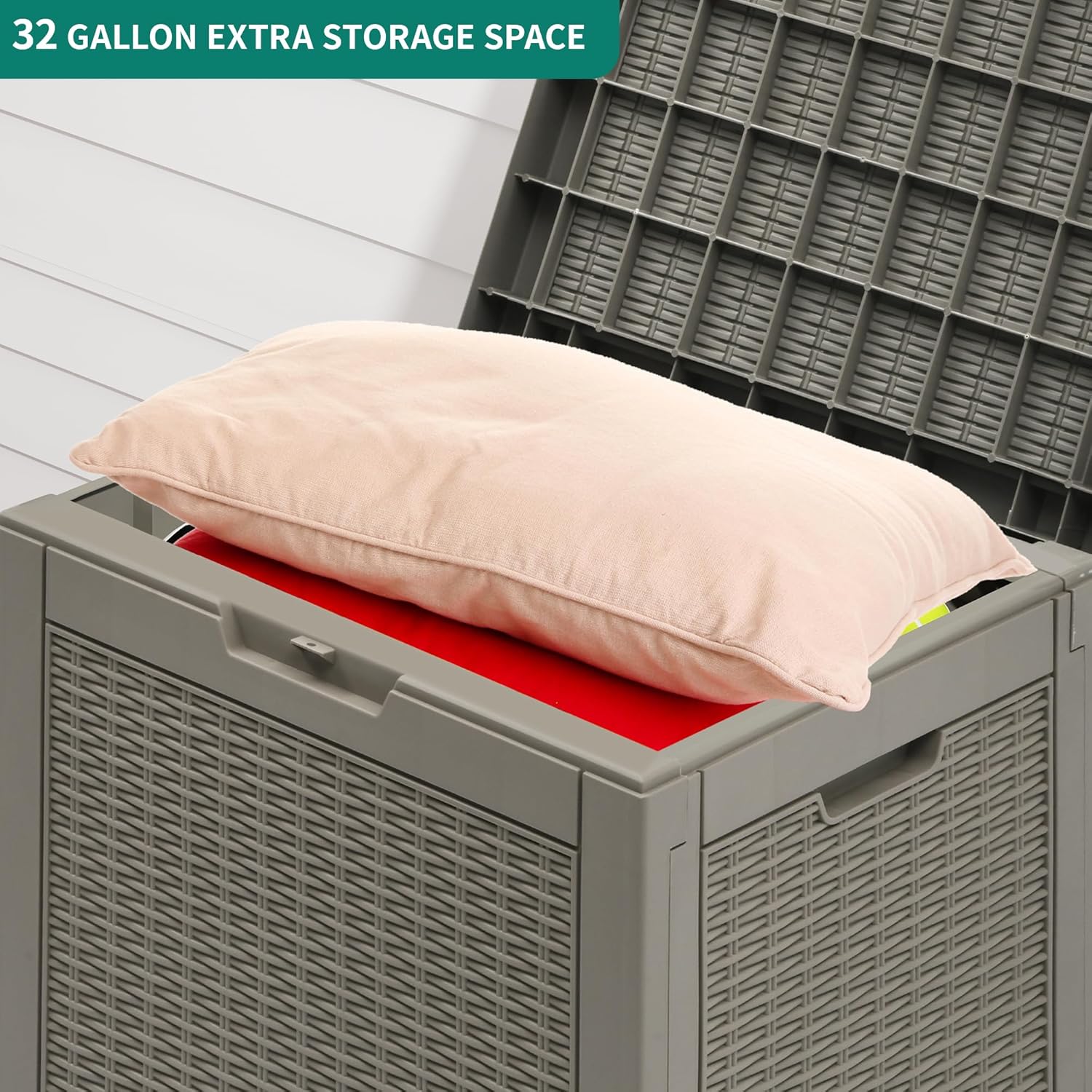 - VERSATILE APPLICATION- This deck box has a 32-gallon capacity that provides ample room for daily indoor and outdoor storage of cushions, garden tools, etc.; Can also be used as a side table, patio seating, storage ottoman, or footstool