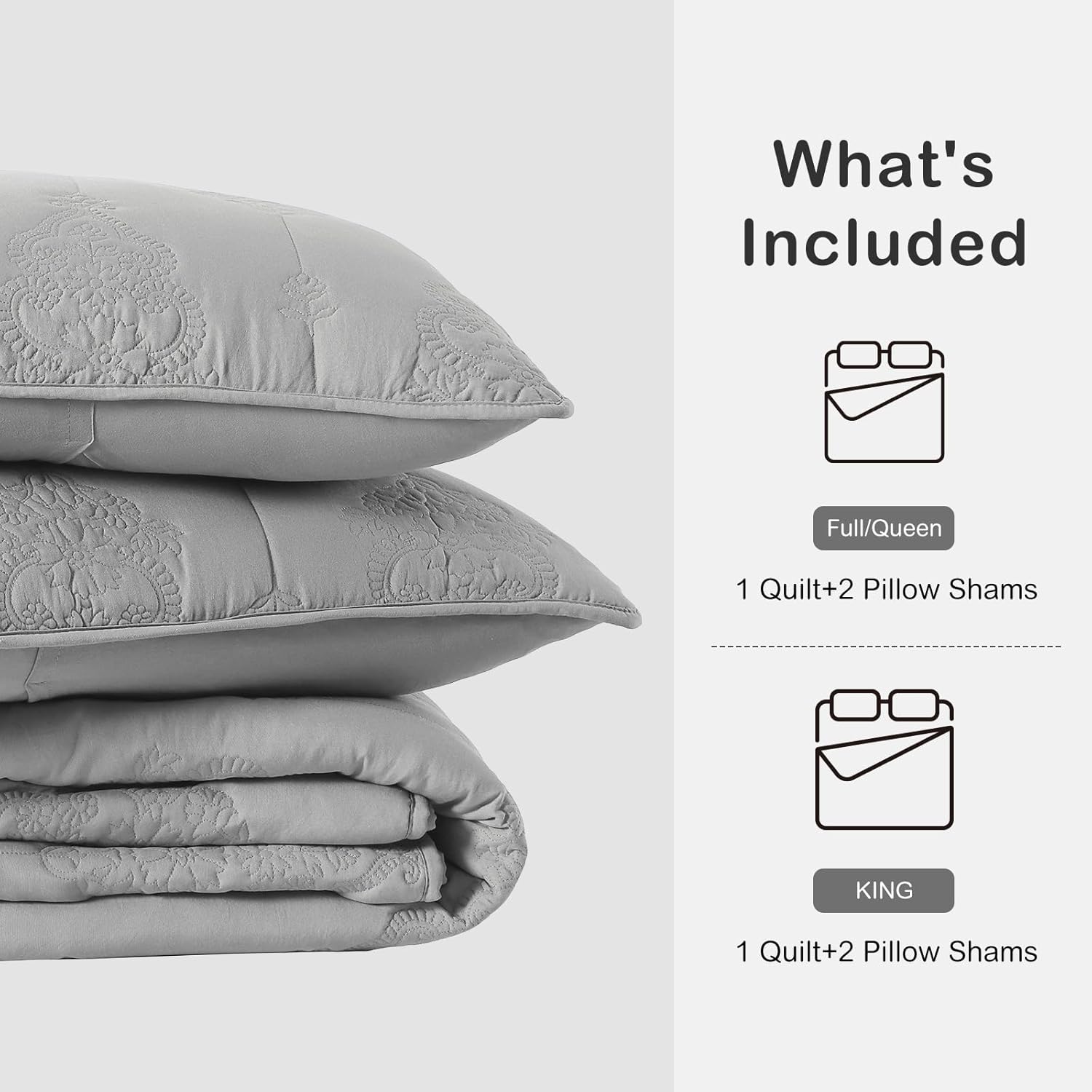 HORIMOTE HOME Grey Quilt Queen Size Floral Quilt Bedspread Lightweight Soft Pre-Washed Microfiber Bedcover, 3 Pieces Thin Comforter Bed Cover Bedding Set for All Season