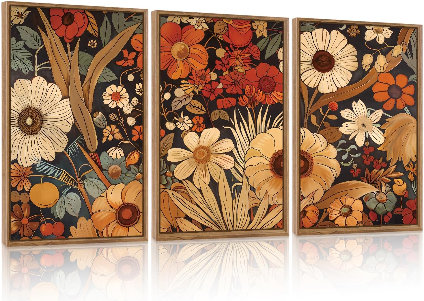 Aurlan Boho Burnt Orange Terracotta Wildflowers Framed Wall Art(24"x36"), 3 PCS Abstract Floral 3D Textured Canvas Artwork, Large Modern Vintage Botanical Nature Art Wall Decor for Home Office Living Room Bedroom