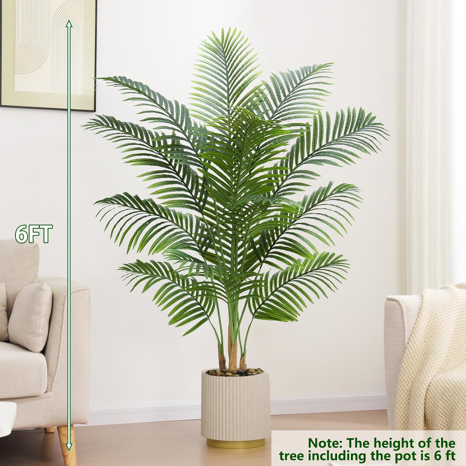 Artificial Palm Tree Plant 6FT Tall Fake Tropical Palm Tree in Pot, Real Bark Design Faux Areca Palm Tree for Home Office Living Room Bedroom Farmhouse Modern Indoor Outdoor Topiary Tree (18 Trunks)