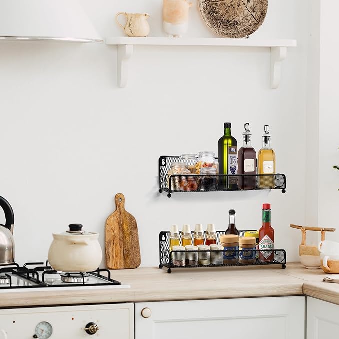 - Multi-Purpose Storage Solution: Use these racks as a spice rack wall mounted AND countertop, pantry door organizer, or hanging storage baskets organizer. Great for organizing spices, toiletries, cleaning supplies, or decorative items in any room.Space-Saving and Organized Storage: Designed as a pantry door organizer and hanging storage baskets organizer, this wall mount rack maximizes space efficiency in any room. Keep your kitchen, pantry, bathroom, or shower clutter-free and organized.