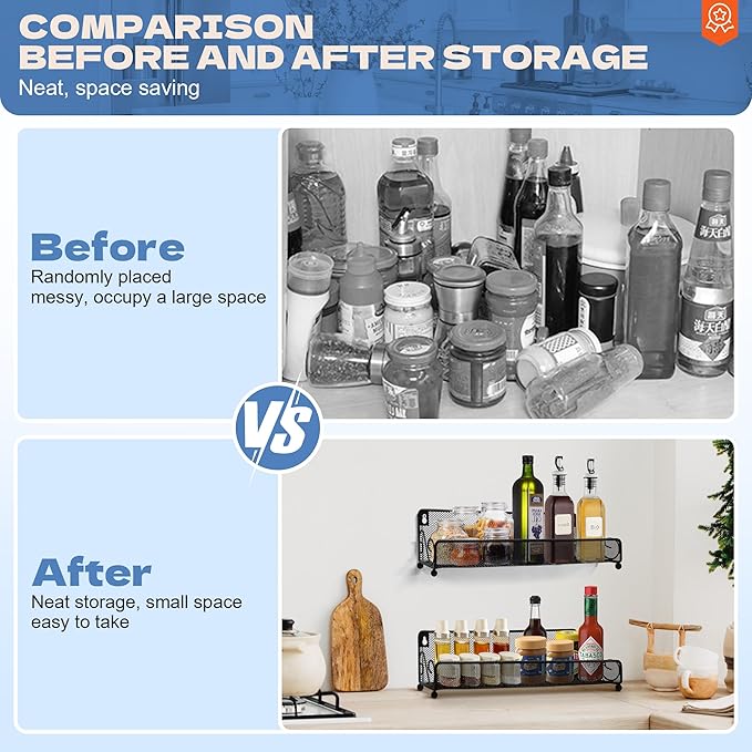 - Premium Metal Material and Stable Storage: The spice rack wall mounted is made of thickened high-strength carbon steel,is waterproof, rustproof, easy to clean.Our spice rack comes with additional 2.36-inch side guards and reinforced adhesive stickers to ensure safety and stability.