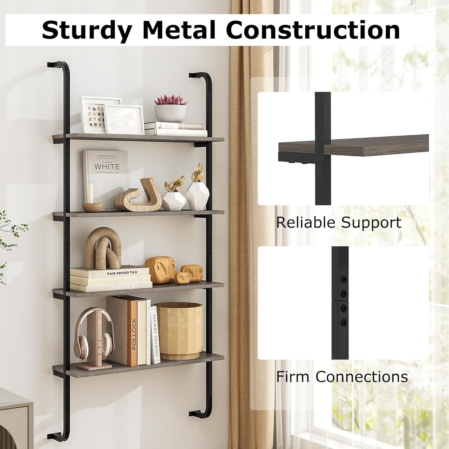 Giantex 4-Tier Industrial Bookshelf of 2, Wall Mounted Pipe Shelving Unit, Floating Shelves with Metal Frame, Hanging Wall Display Shelf, Wood Ladder Bookshelf for Living Room, Kitchen,Gray Oak