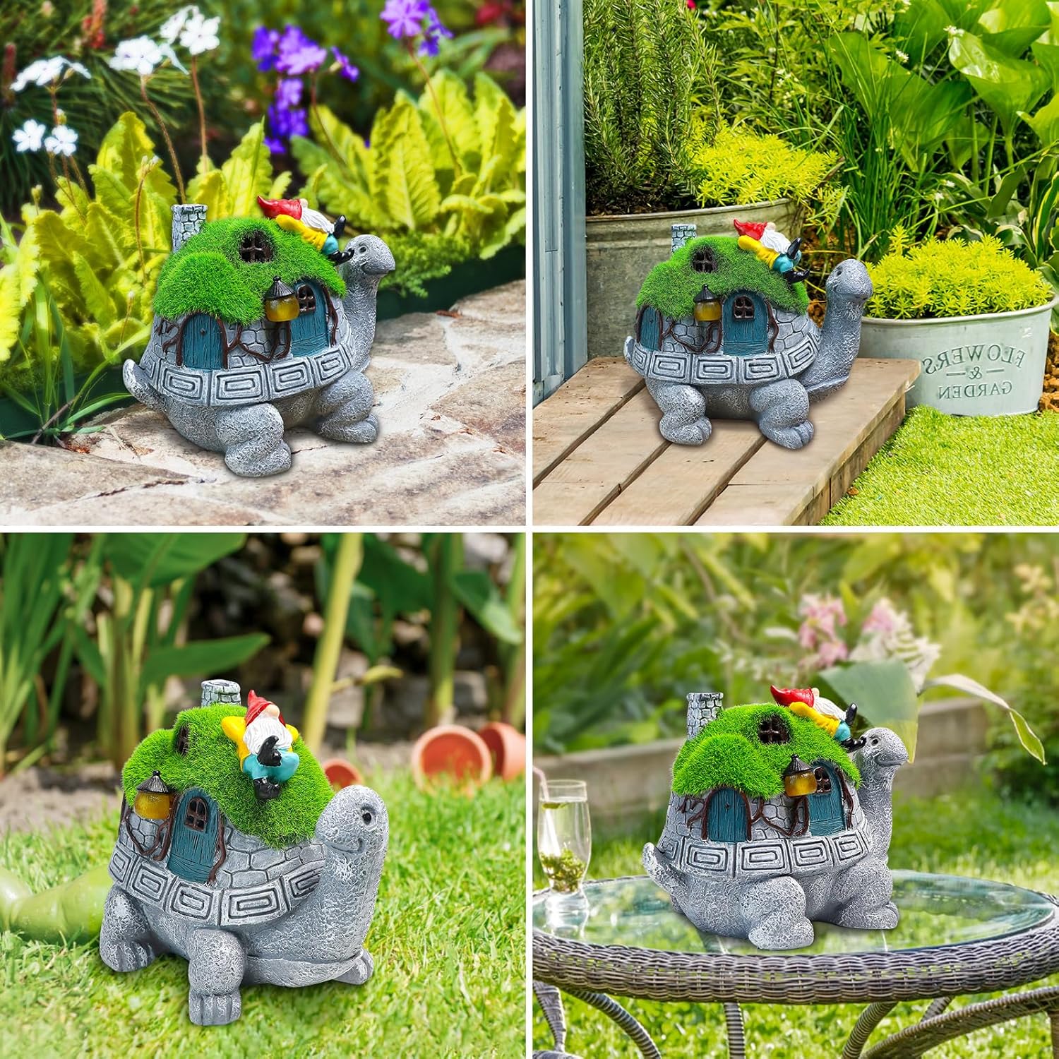 - The Turtle Decor Cute: A charming turtle house solar light, featuring a luminous design, harmonizes with lush lawns and little gnome, transforming into a warm, delightful highlight at night, infusing gardens with playfulness and vitality. As a solar-powered garden decor, this cute turtle carried the gnome on his back, decorating gardens, patios, porches, and water features with creativity and charm.