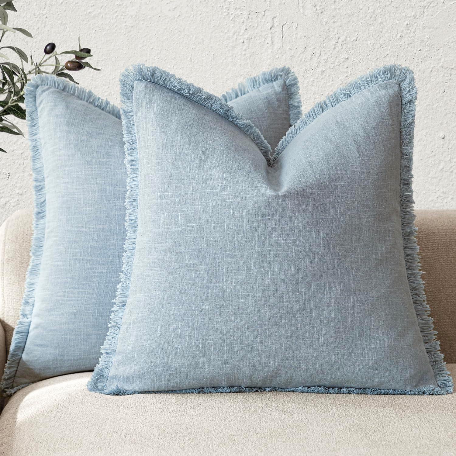 Foindtower Set of 2 Decorative Linen Fringe Throw Pillow Covers Boho Farmhouse Cushion Cover with Tassels Soft Accent Pillowcase for Couch Chair Sofa Bed Living Room Home Decor,20×20 Inch,Sky Blue