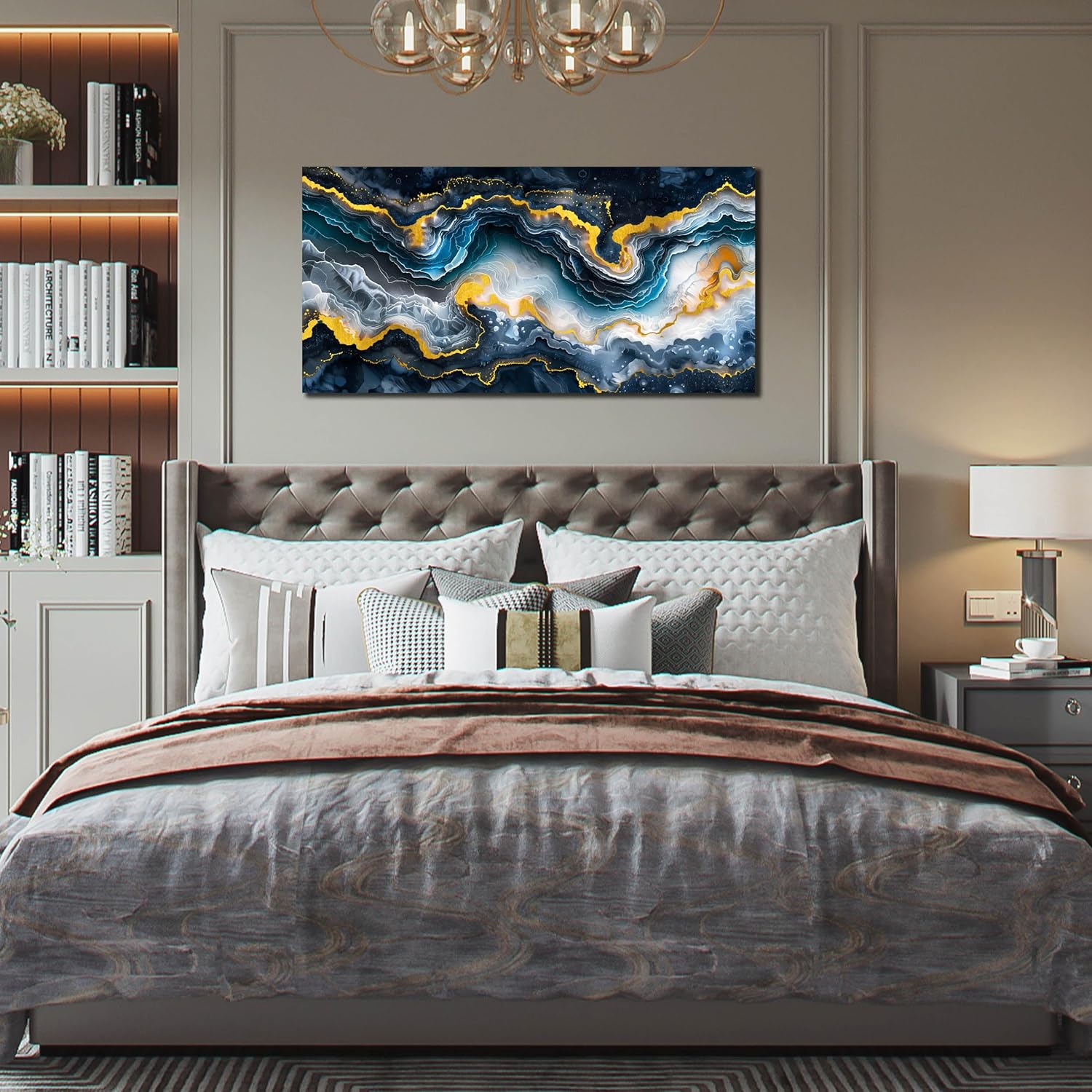 GUGIKA Abstract Wall Art for Living Room, Gold Black and Blue Canvas Wall-Art for Bedroom, Ocean Landscape Print Paintings, Size 40x20 Inches