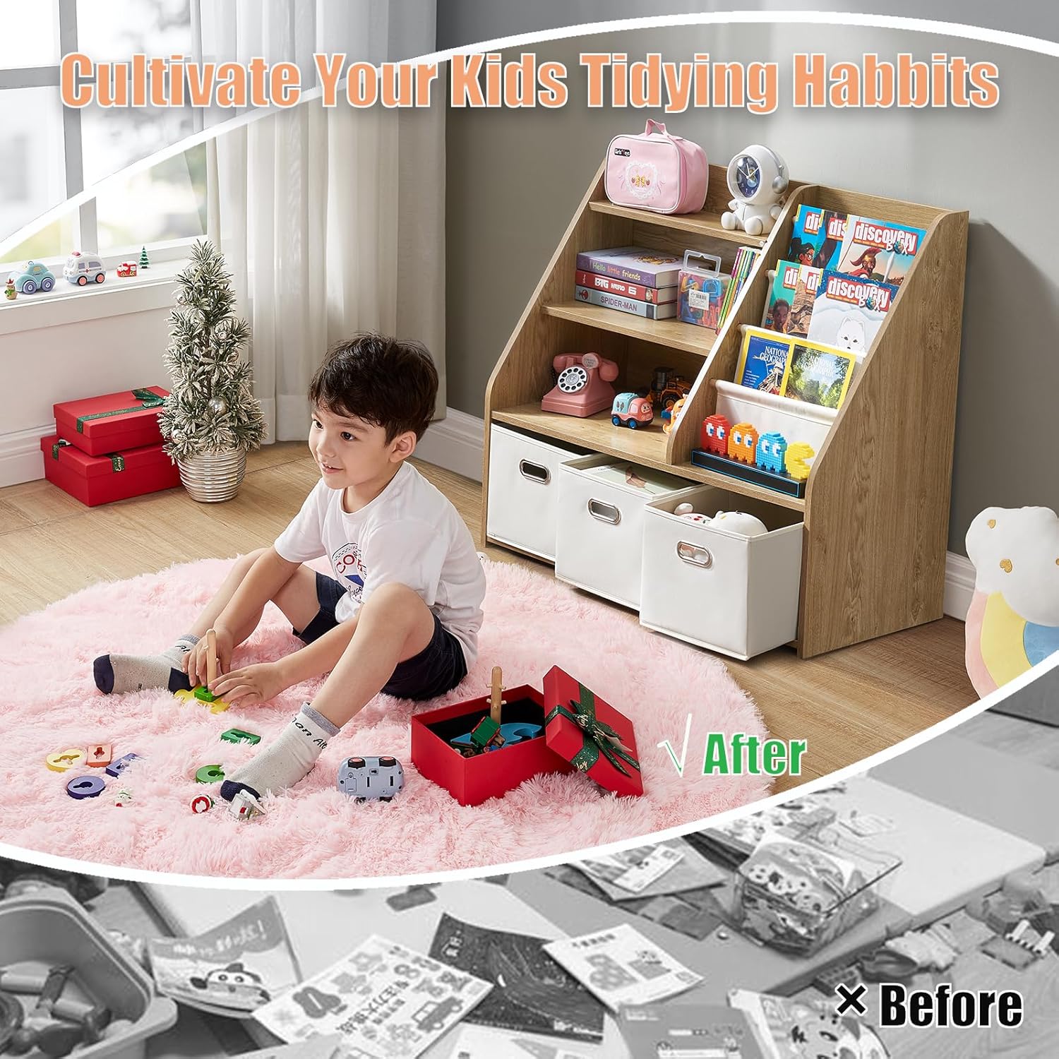 - ⭐️ [Quick Assembly & Versatile Placement] Comes with all tools and a clear manual for easy setup. Whether it’s in the kids' room, playroom, nursery, classroom, or reading corner, this bookshelf with toy bins helps keep your child’s space neat and tidy — and it’s easy to wipe clean.