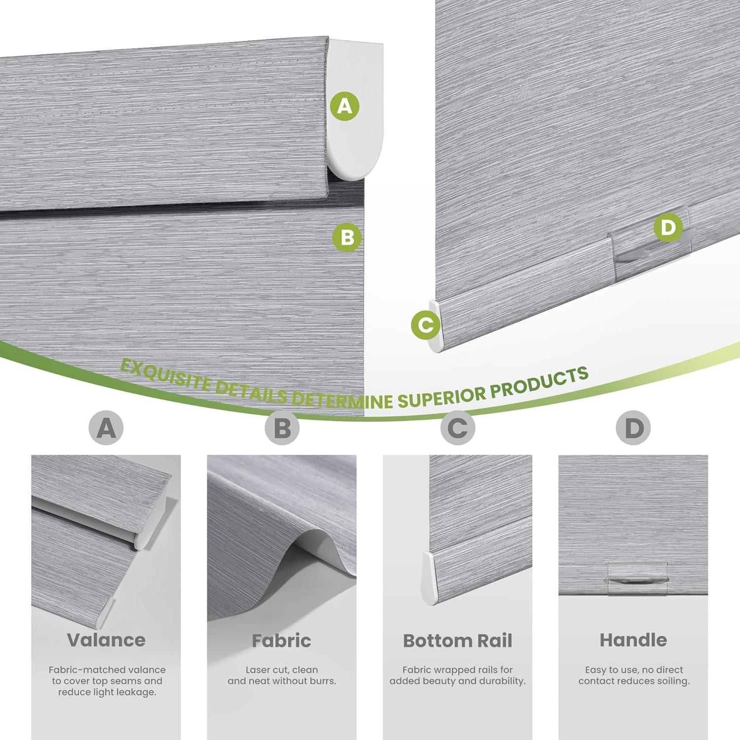 - [Valance Blackout Design, Luxurious and Elegant] Blackout roller shades add an extra layer of hand-stitched valance using fabric to effectively cover the seams of the top rail and reduce light leaks. Give you an excellent light-blocking experience. While the product as a whole using fabric wrapped, uniform color scheme, like a work of art.