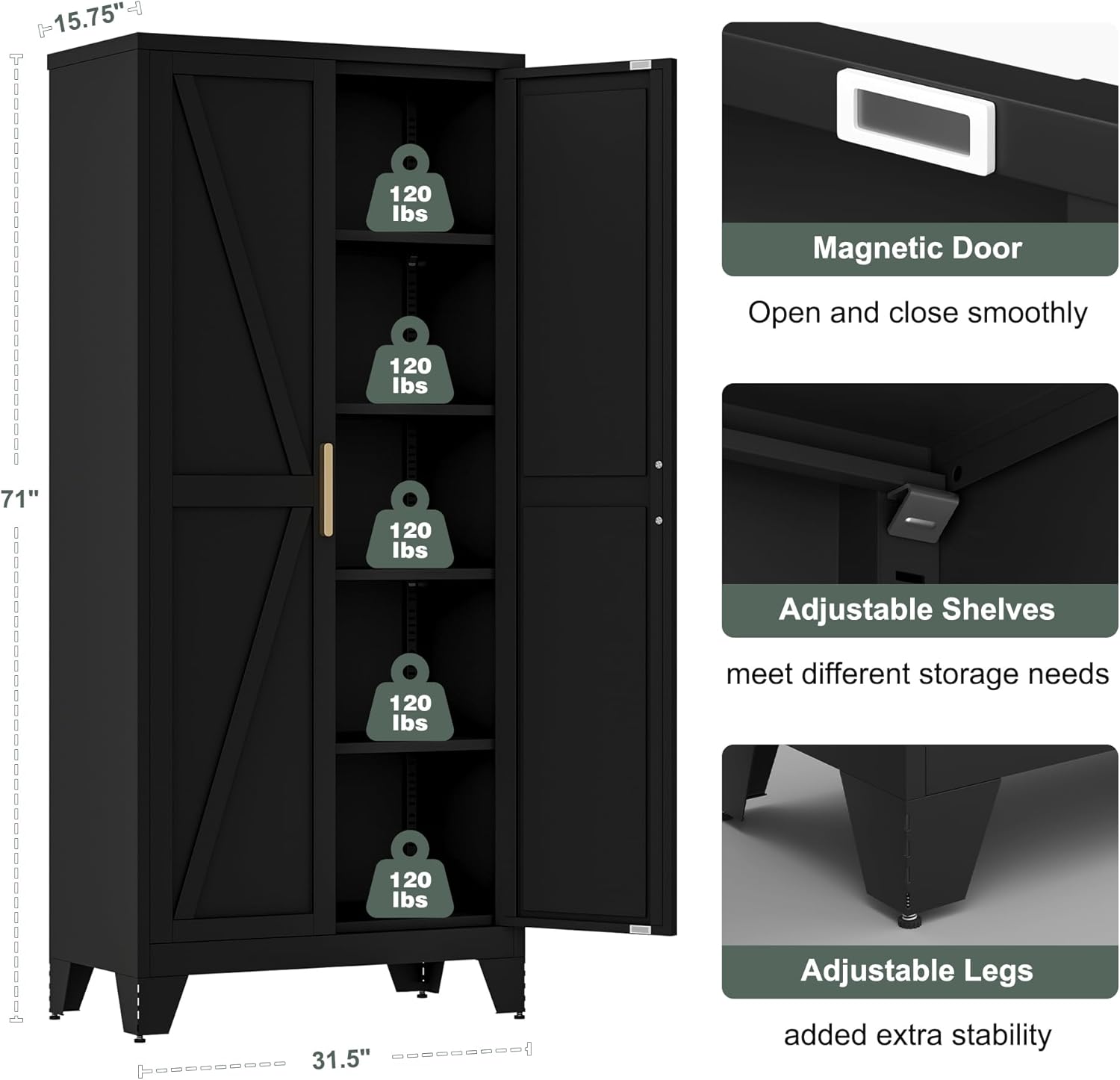 71'' Farmhouse Metal Storage Cabinet with Barn Doors,Steel File Cabinet for Home Office,Kitchen Pantry 4 Adjustable Shelves,Freestanding Cupboard for Kitchen,Home Office (Black)