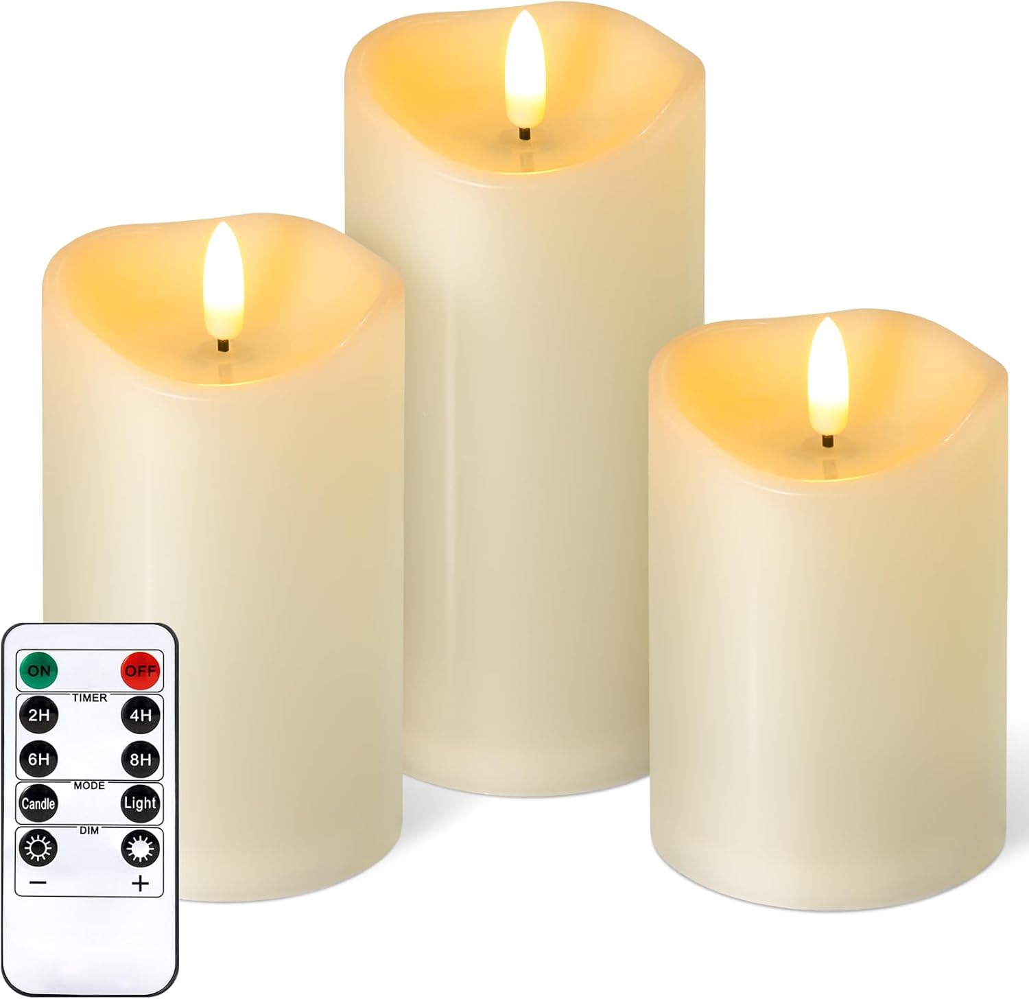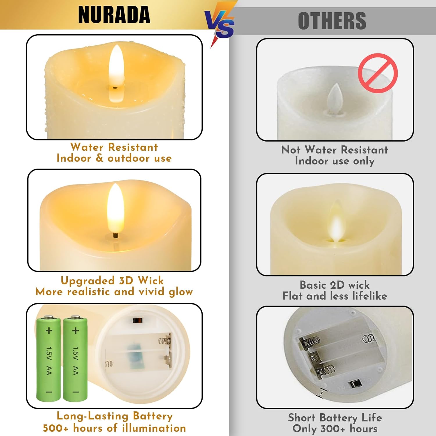 NURADA Outdoor Flameless Candles with Remote Timer - Waterproof Realistic Flickering LED Pillar Electric Battery Operated Fake Candle for Holiday Home Wedding Fireplace Decor - 3 Pack Ivory