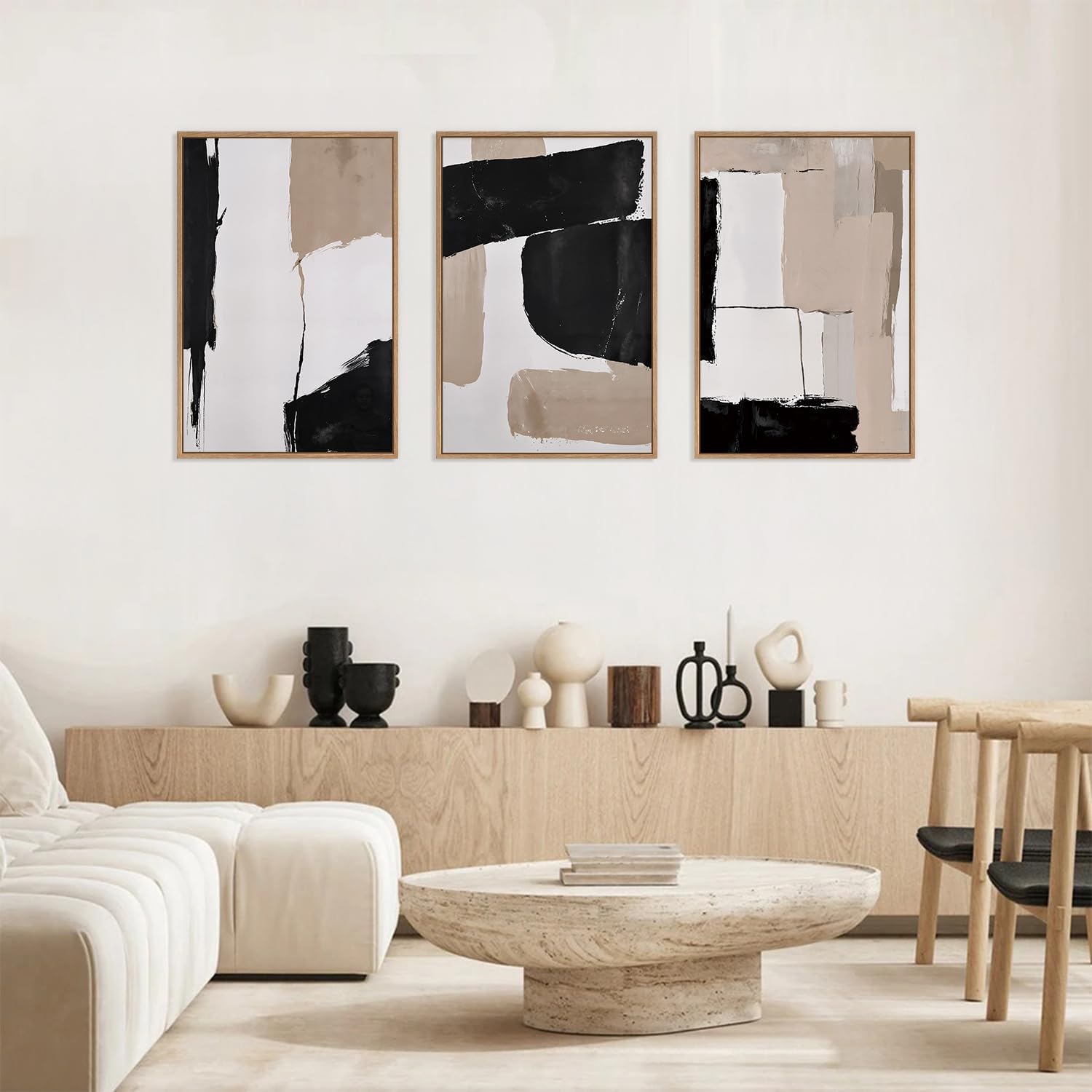HLNIUC Large Framed Neutral Abstract Canvas Wall Art,Black and White Abstract Wall Decor Set of 3(16”X24”)Modern Minimalist Color Block Art Print,Beige Mid Century Wall Painting for Living Room,Office