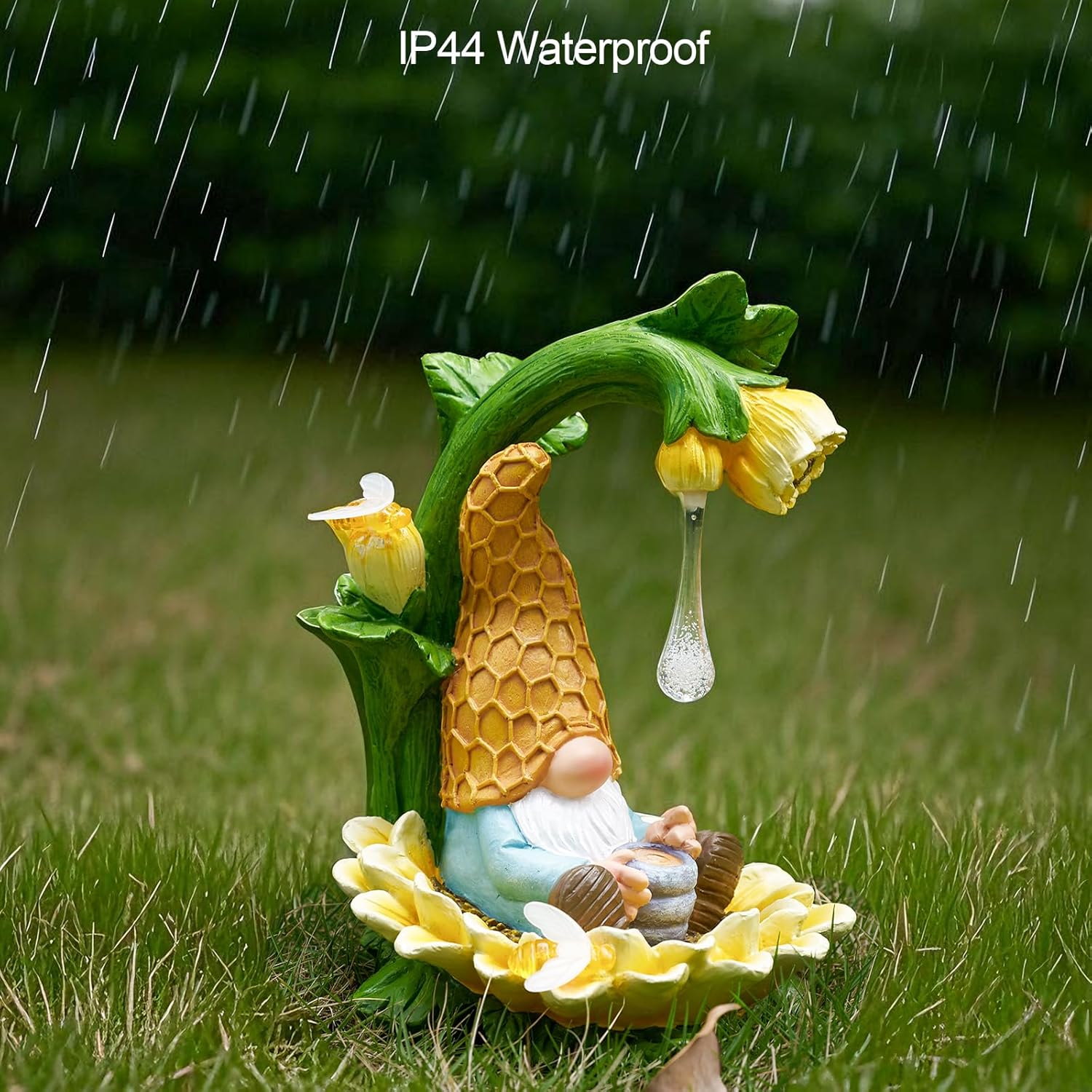 - [Handcrafted Gnome Garden Decor] Featuring a charming gnome resting on flower stems, with one honey-dripping LED light and two bee-shaped lights perched on the flowers, this spring patio decor brings storybook charm to any outdoor space. The solar panel is seamlessly integrated into the floral design