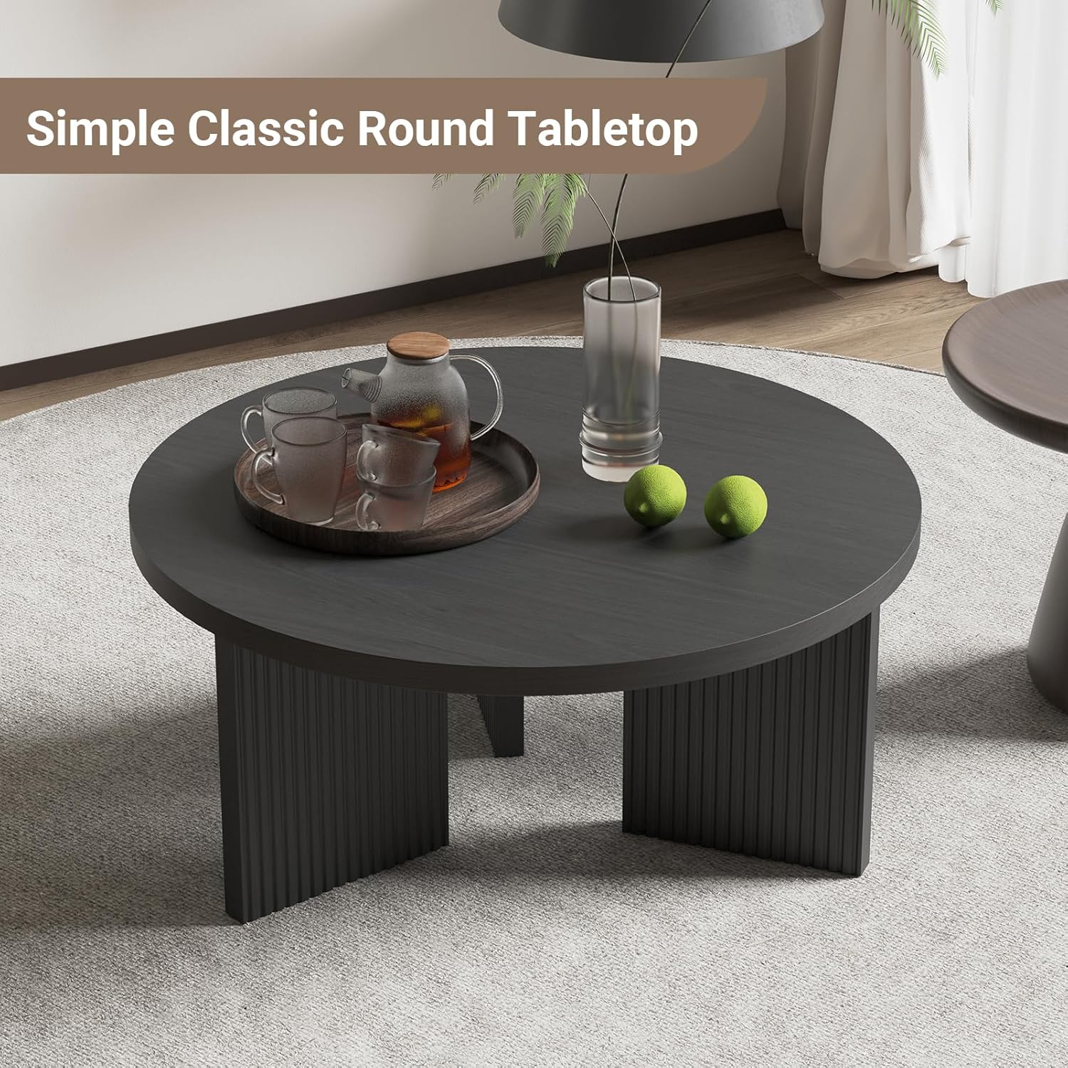Wooden Round Coffee Table, 35" Coffee Table with Smooth Thick Mesa, Low Circle Center Table with X Shaped Stable Legs, Accent Tea Table for Living Room, Office, Black