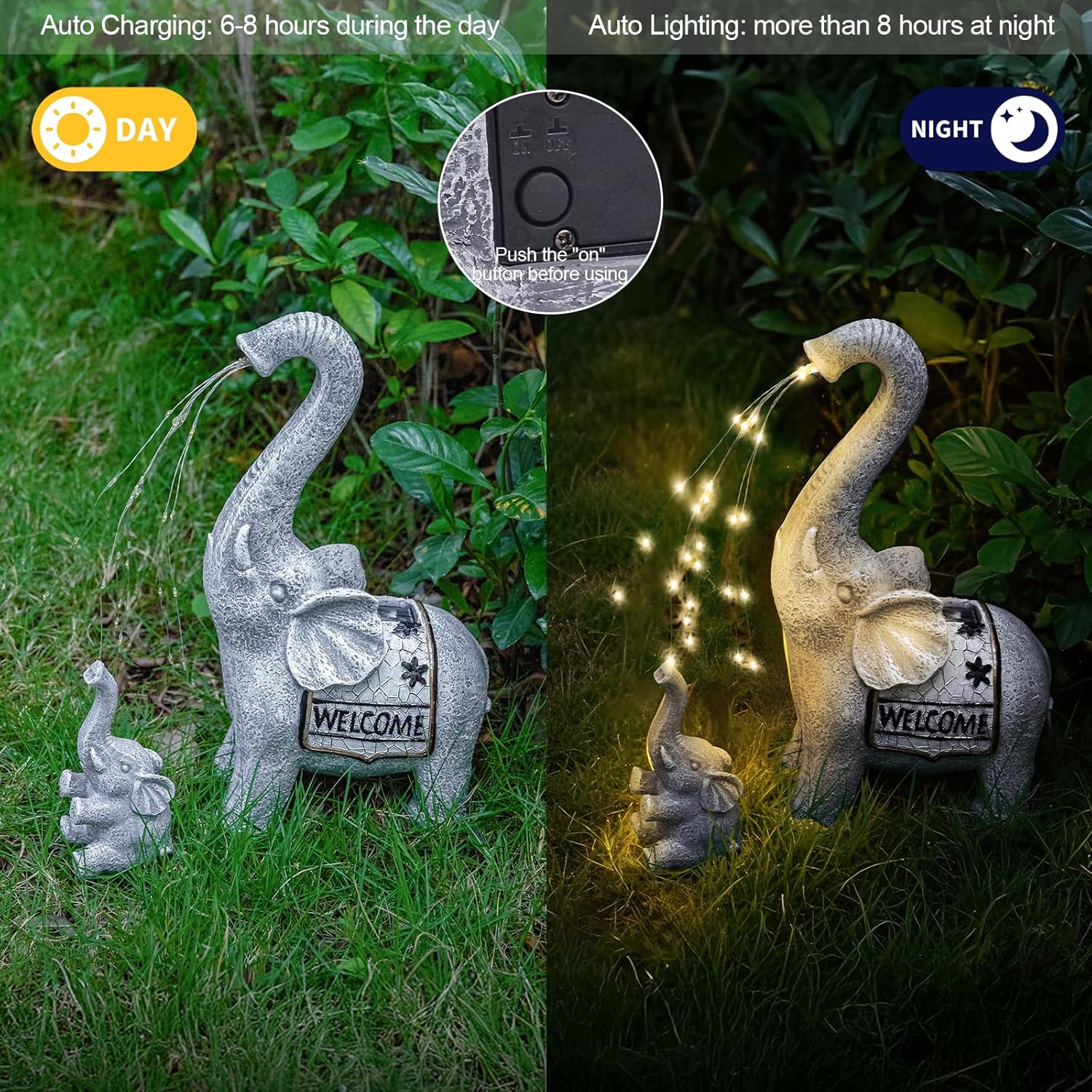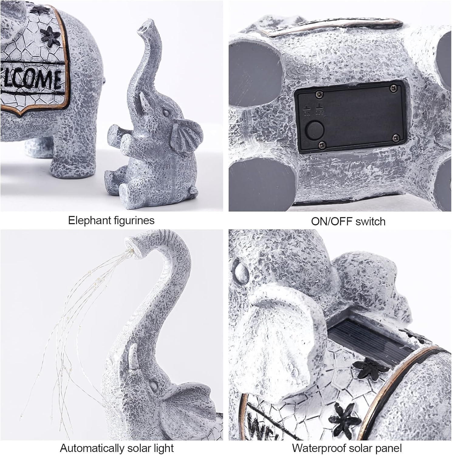 - [Durable Outdoor Garden Decor] Crafted from weather-resistant resin and featuring an IP44-rated solar panel, the elephant statue withstands rain and seasonal changes. Ideal for outdoor garden decor, garden statues for outside, lawn ornaments, and outdoor decorations for yard