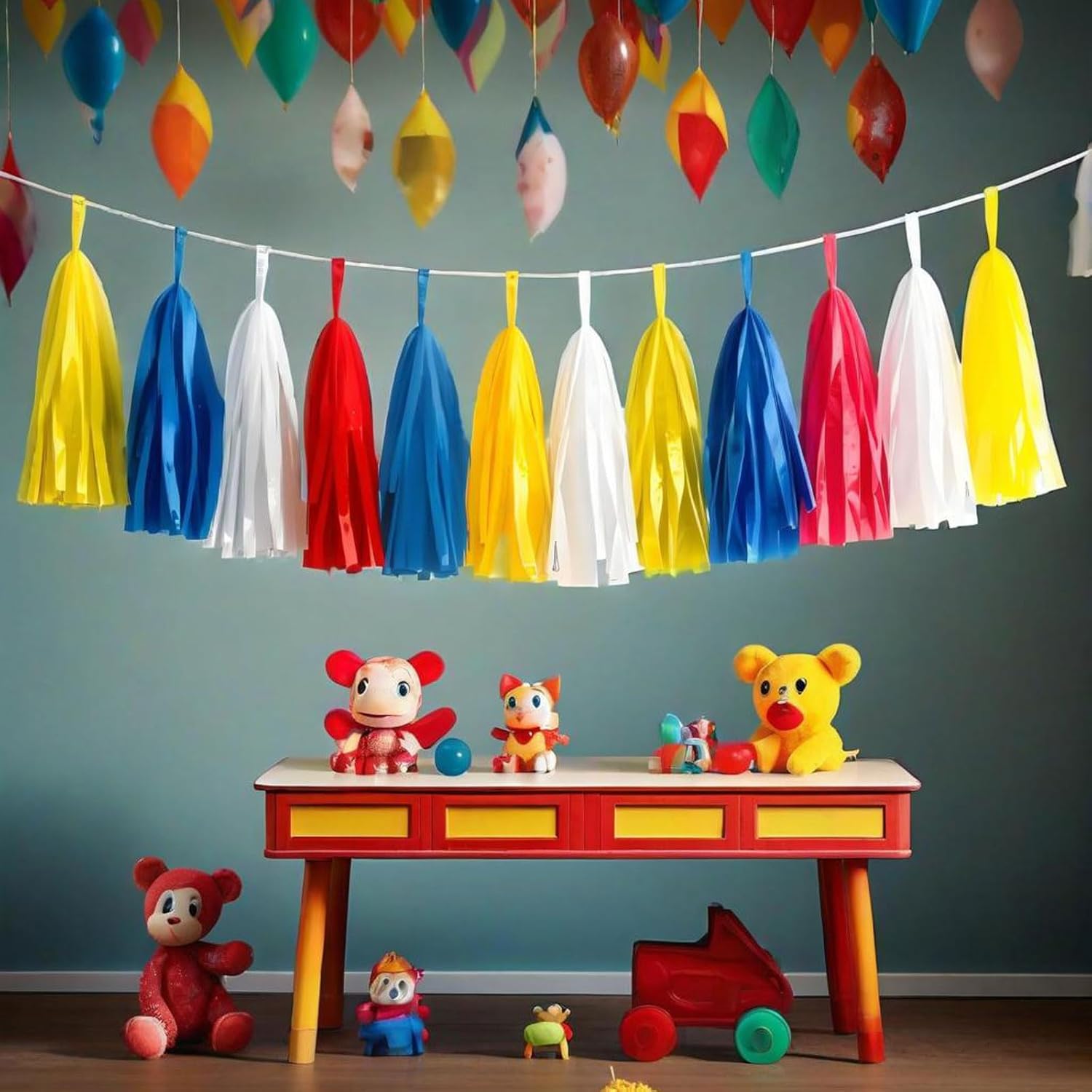 - PACKAGE CONTENTS: Set of 20 tissue paper tassels in red, blue, yellow, and white colors, pre-strung on a 6-foot twine for easy hanging and instant decoration