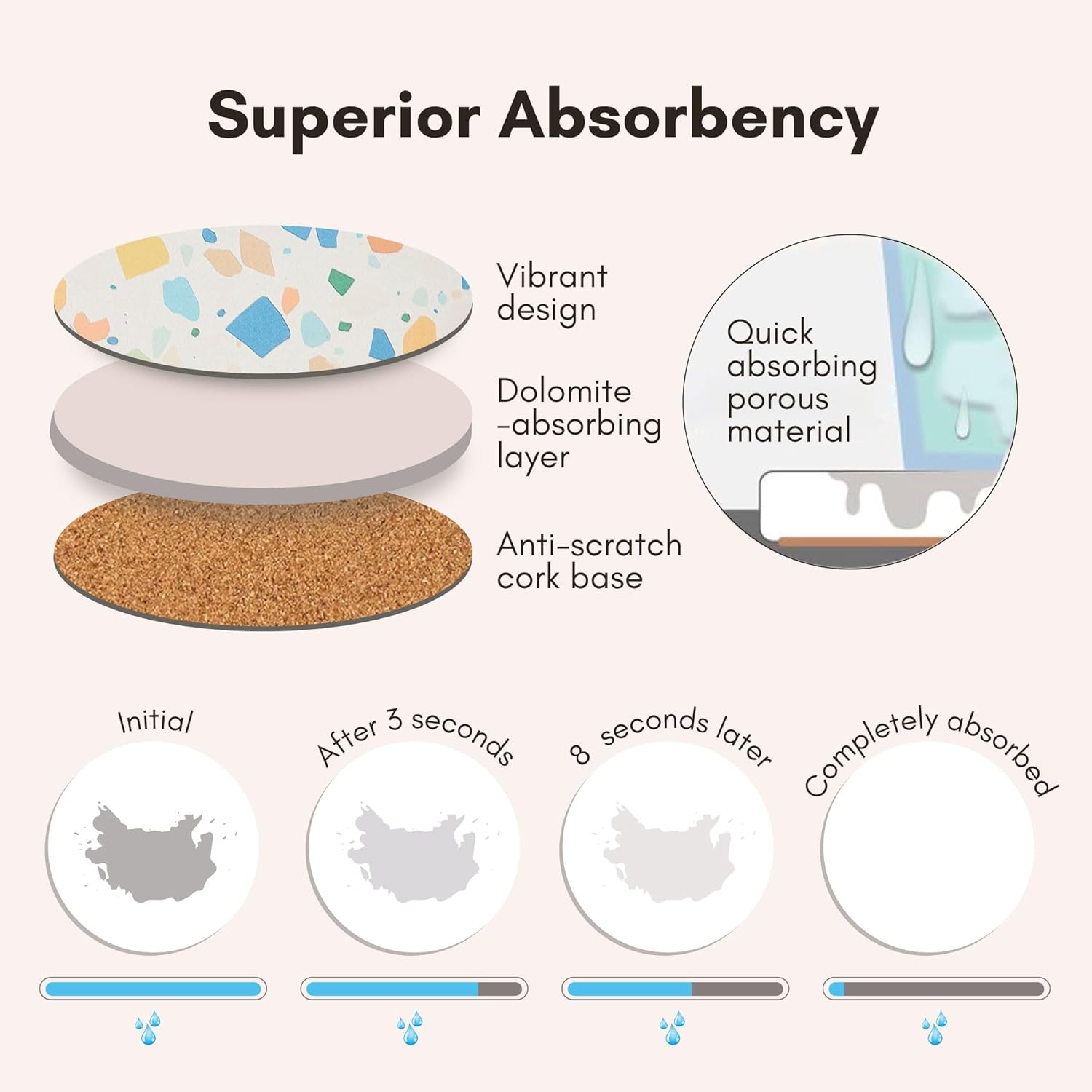 - Highly Absorbent for Hot & Cold Drinks: Our absorbent coasters are made of quality diatomite that absorbs condensation from cold drinks, spills from hot drinks and the absorbency will not detoriate over time.