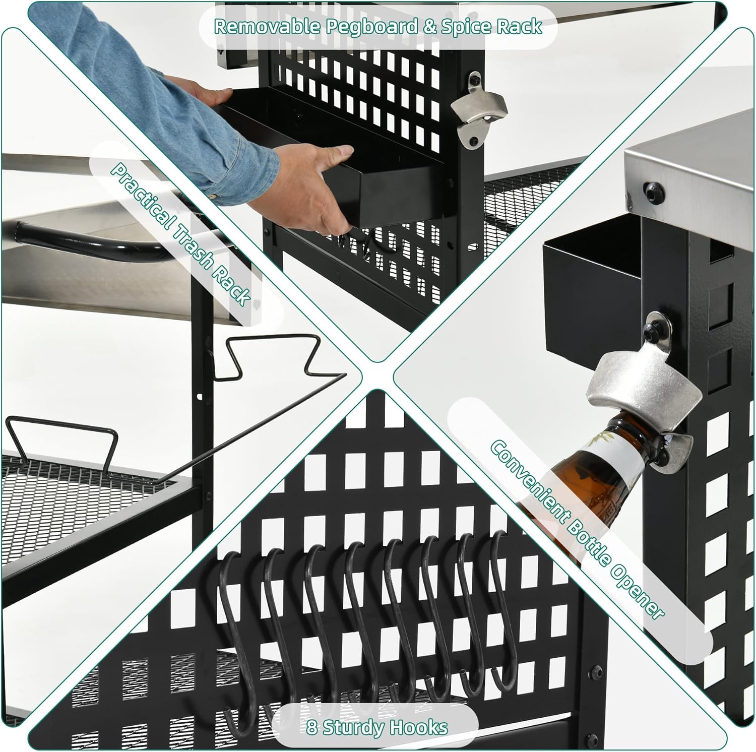 - Thoughtful Organizational Features: Stay organized with a drop leaf, a removable spice rack, 8 sturdy hooks, a bottle opener, and a trash bag holder. Our grill table keeps essentials conveniently at hand for a seamless cooking experience
